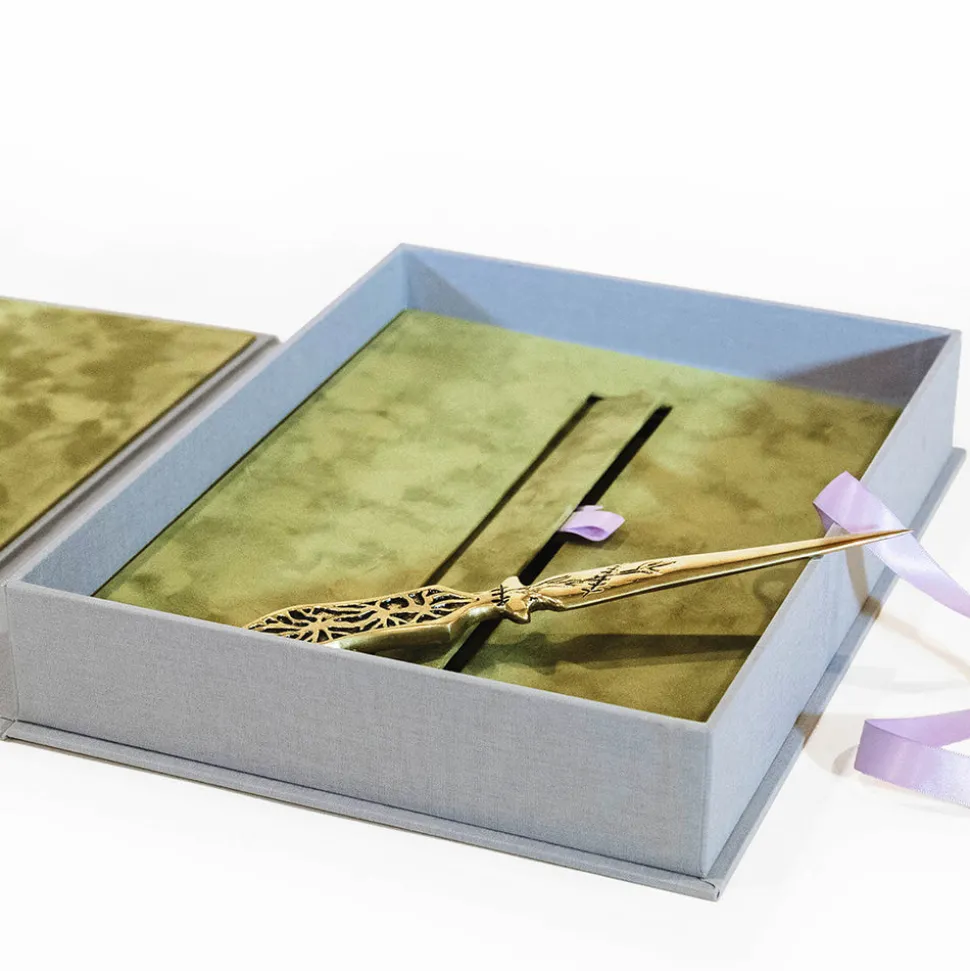 374 pages. Arrives in a custom cloth covered presentation box. Hardcover with foil embossing and vegan leather spine. Hand-sewn pages and binding. Created by an independent book design team. Custom end leaves design by artist Abby Olsen. Artisan-designed and hand-casted Brass Letter Opener. Please note the enclosed brass letter opener is a sharp, pointed object. Exercise caution when gifting and do not put within reach of children.