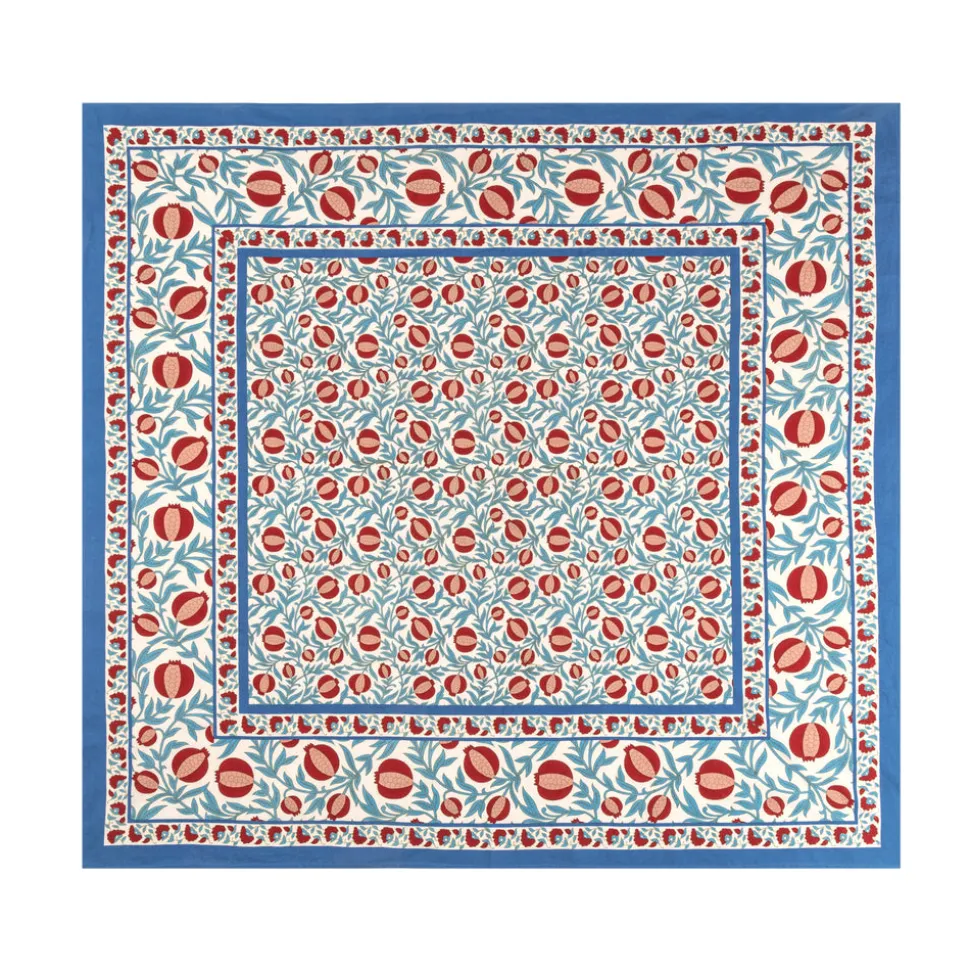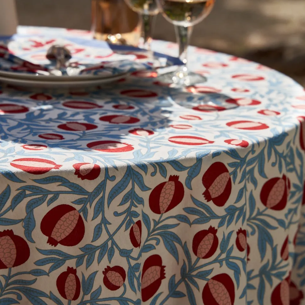 Idyllic landscapes, sumptuous colors, and the vibrant beauty of Southern France describes Couleur Nature. This brand of hand-painted table linens aims to bring a Provençal sense of effortlessness, rich culture, and joie de vivre to your life and home—no matter where you live. The French Tablecloth Grenadine in Red and Blue features ripe pomegranate arils and delicate floral motifs. Creating a sweet and fresh way to brighten up your space, this high-quality piece is a must-have for dine-in memories. An elegant addition to any tablescape.