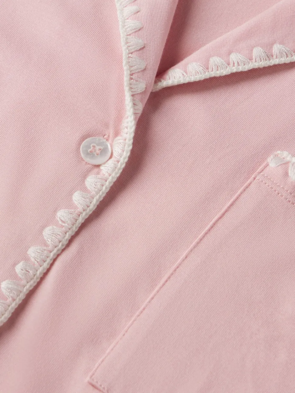Cheeky shorty set. Classic slim fit short sleeve top. Button front top with notch collar and functional pocket. Low-rise cheeky short with thin elastic waistband. Contrast whipstitch detail on both top and short.