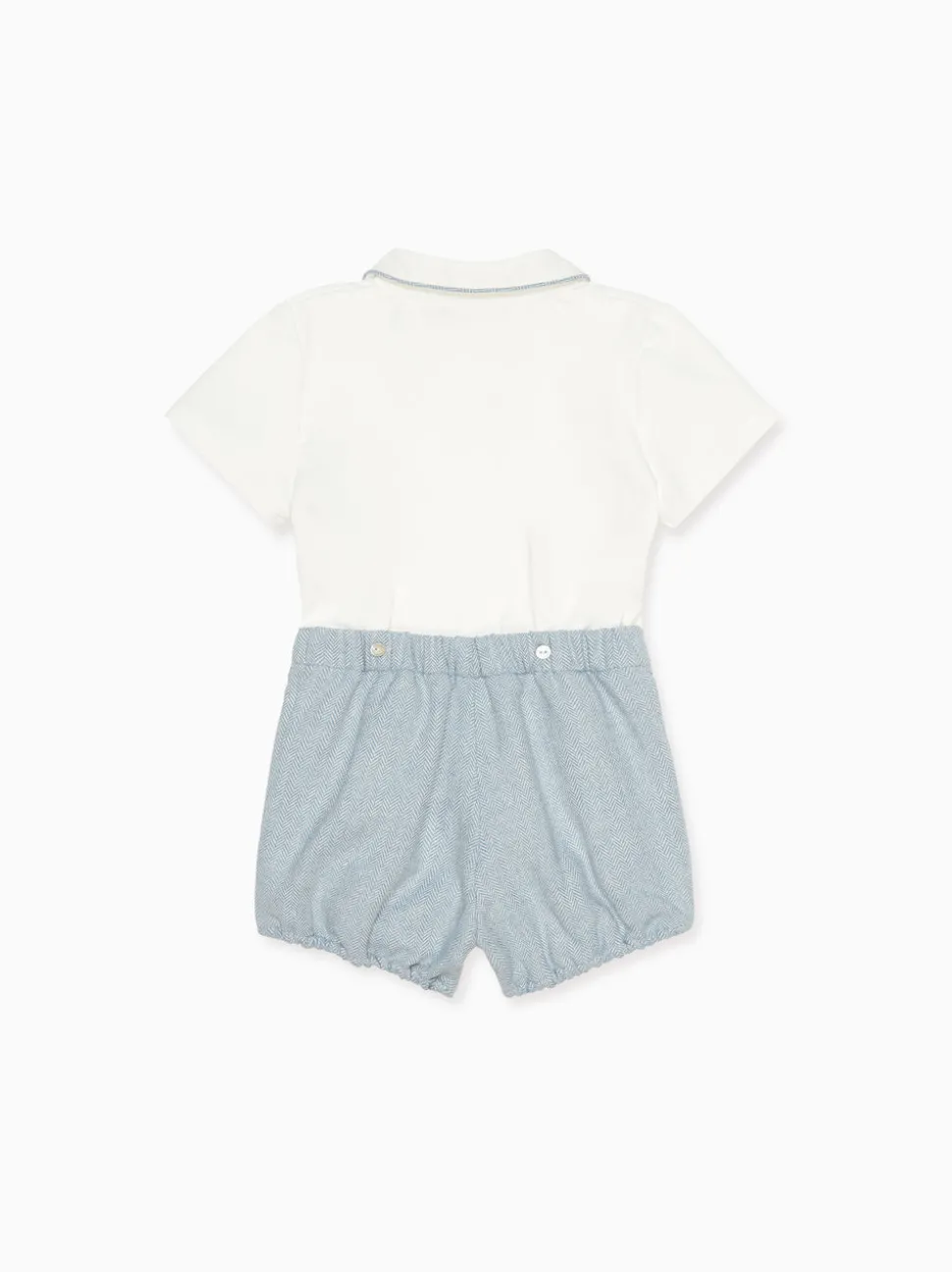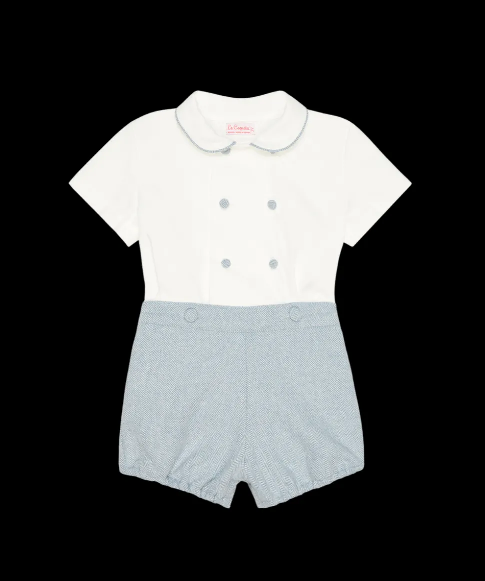 Nestled in Notting Hill but proudly made in Spain, La Coqueta was established in 2013 by Celia Muñoz, a mother of five. Known as Celia’s “sixth child,” La Coqueta marries modern traditionalism with Spanish nostalgia. An exclusive collaboration with Over The Moon, the Friso Baby Boy Set comes in a traditional two-piece outfit and features a short-sleeved white shirt with attached shorts in a refined but adorable white herringbone. That pattern can also be found along the piped trim of the Peter Pan collar and on the matching covered buttons throughout.