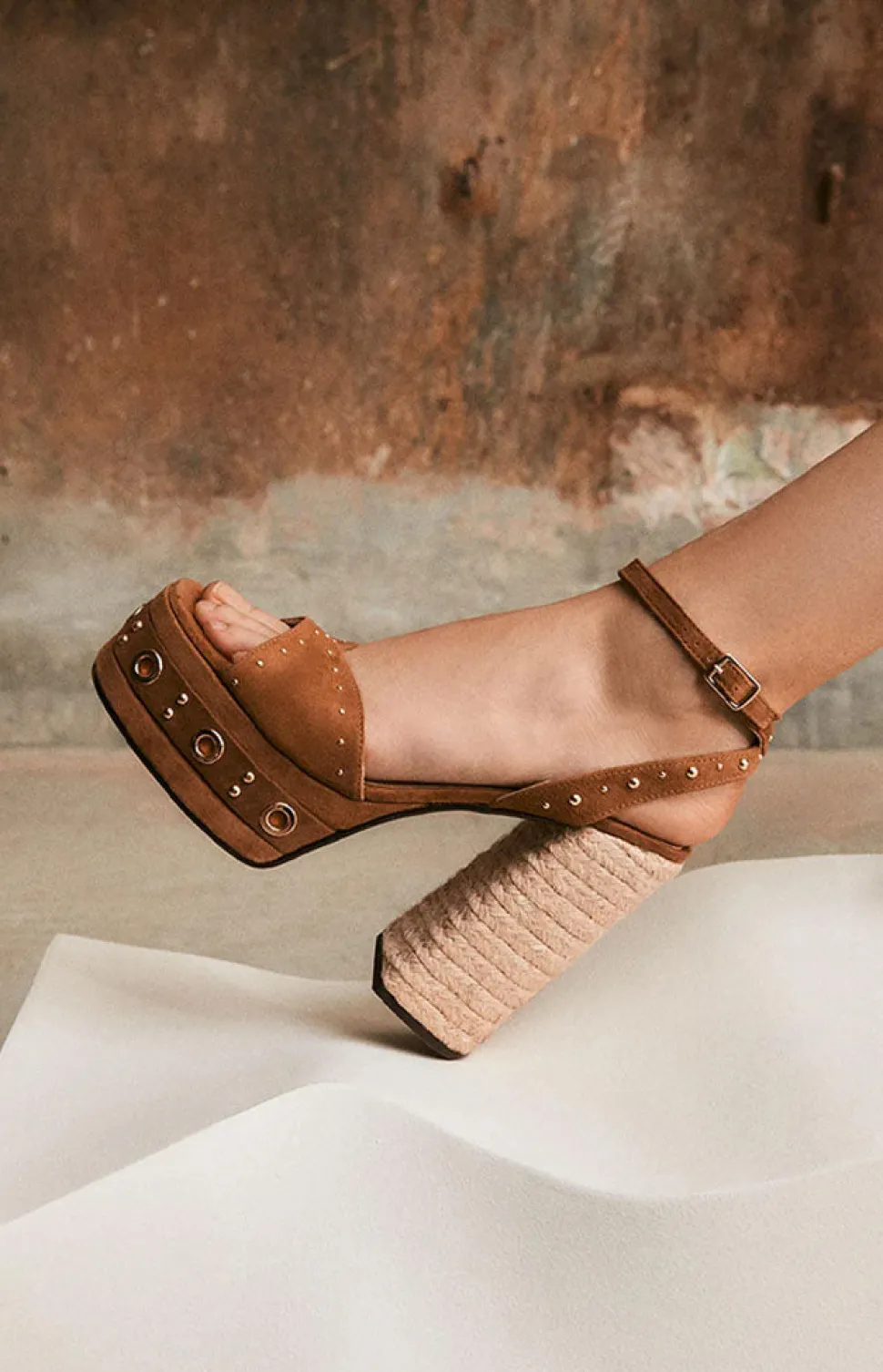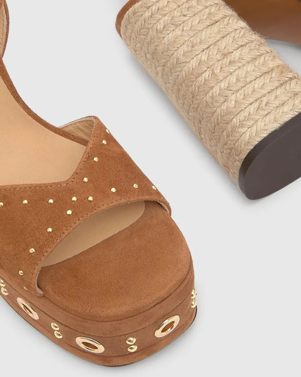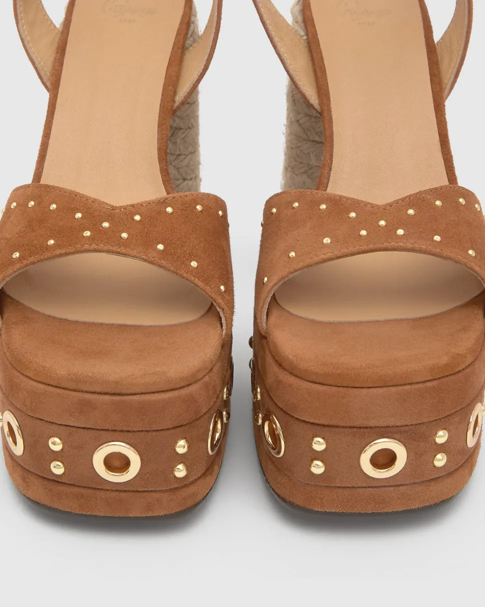 Founded in 1927, Castañer has elevated the espadrille into a sophisticated symbol of timeless design. With a commitment to craftsmanship, tradition, and natural materials, the brand continues to blend heritage with innovation, earning global recognition while staying true to its authentic roots. The Fruamba in Cuoio Leather is crafted in suede with bracelet closing, cushioned insole, and studs in the upper and platform. Features a jute heel.