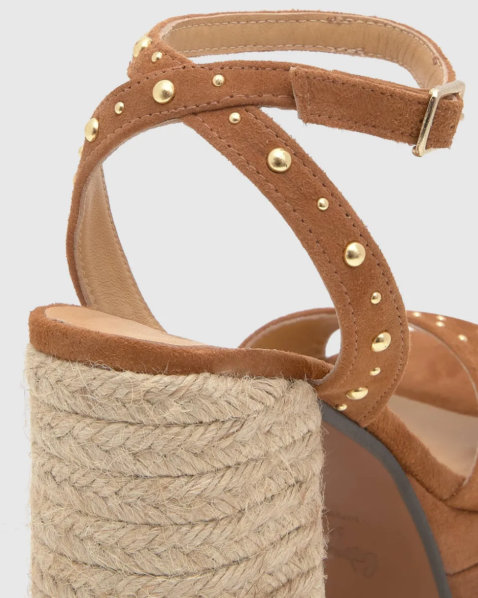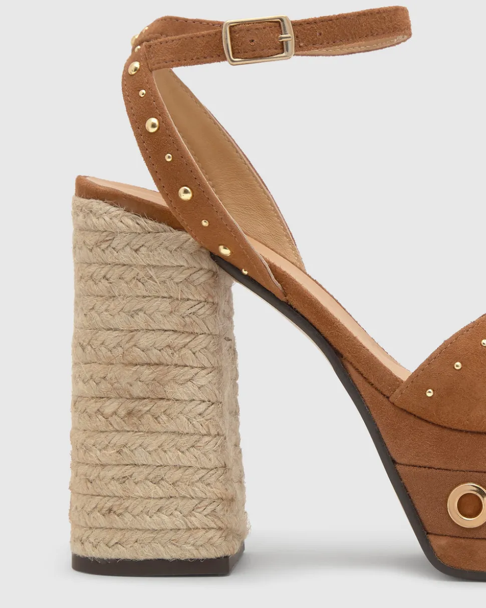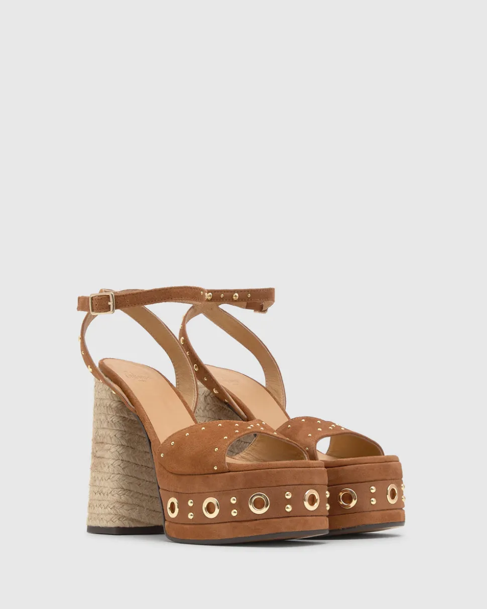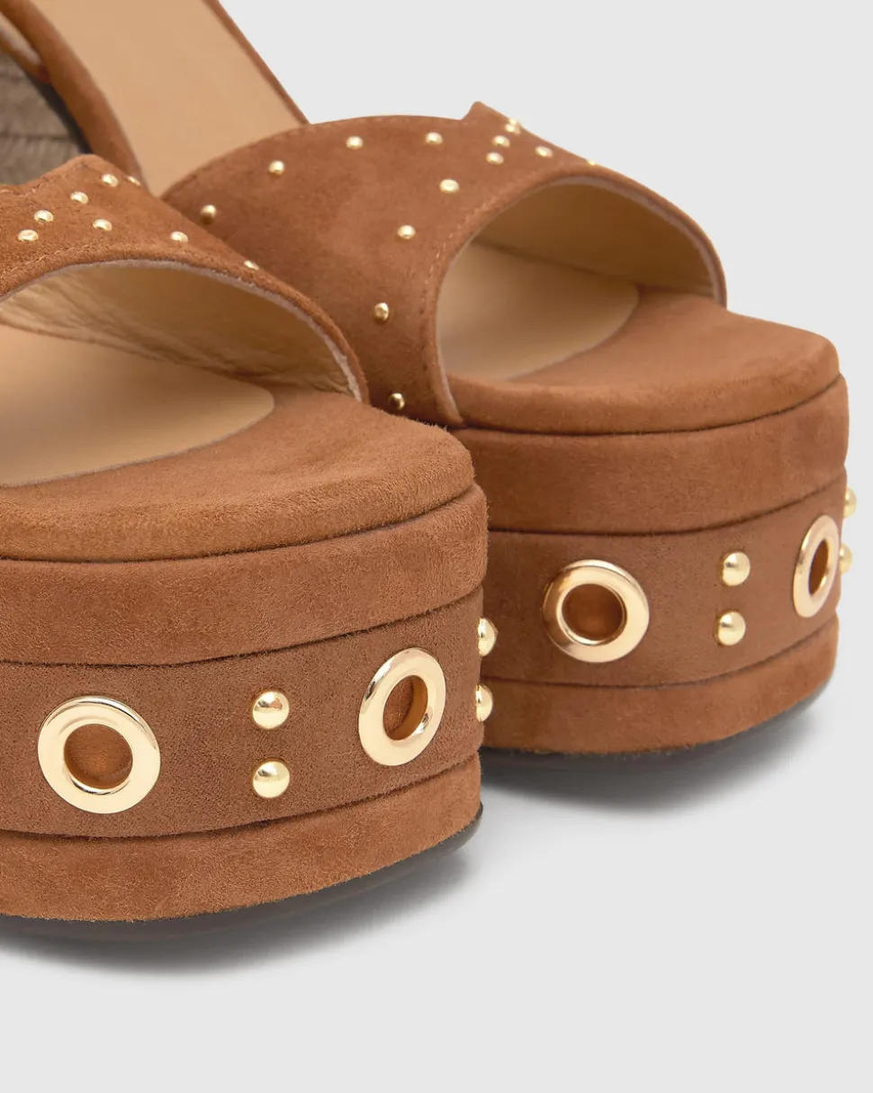 Founded in 1927, Castañer has elevated the espadrille into a sophisticated symbol of timeless design. With a commitment to craftsmanship, tradition, and natural materials, the brand continues to blend heritage with innovation, earning global recognition while staying true to its authentic roots. The Fruamba in Cuoio Leather is crafted in suede with bracelet closing, cushioned insole, and studs in the upper and platform. Features a jute heel.