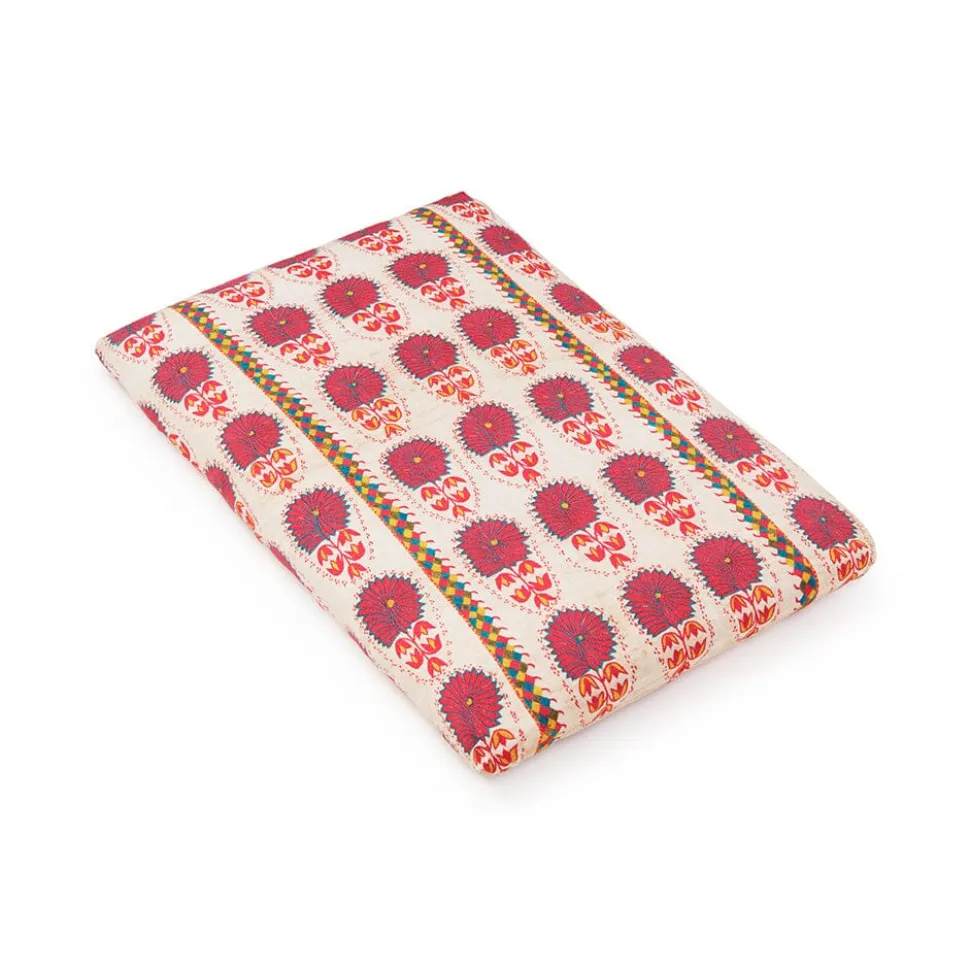 This bedding is inspired by Suzani embroidery, which is a classic Central Asian textile characterized by flowers and meandering vines, made with a tambour hook. Though Uzbek stitched, the motif presented here is Turkish – a tree of life. Suzani tree of life designs represent three spheres: the roots spring from the underworld, the trunk rises through the terrestrial world, and the branches reach the heavens. These textiles are traditionally used as wall hangings or as a woman’s marriage dowry, as the fruit designs are symbolic of fertility. The suzani’s decorative embroidery is also thought to possess a protective element.
