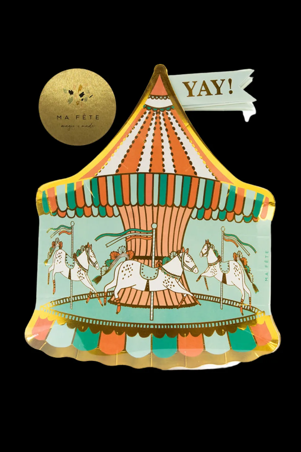 A mom with two young children, Anna Bacon found herself bored with the same old party themes, which is how Ma Fête (“My Party” in French) was born. She creates boxes of matching party materials—plates, cups, napkins and more—with fun, kid-friendly motifs, helping parents throw the most memorable parties, with minimal effort. The Fun Fair series brings with the fairgrounds to you with a colorful carousel—perfect for birthday parties.