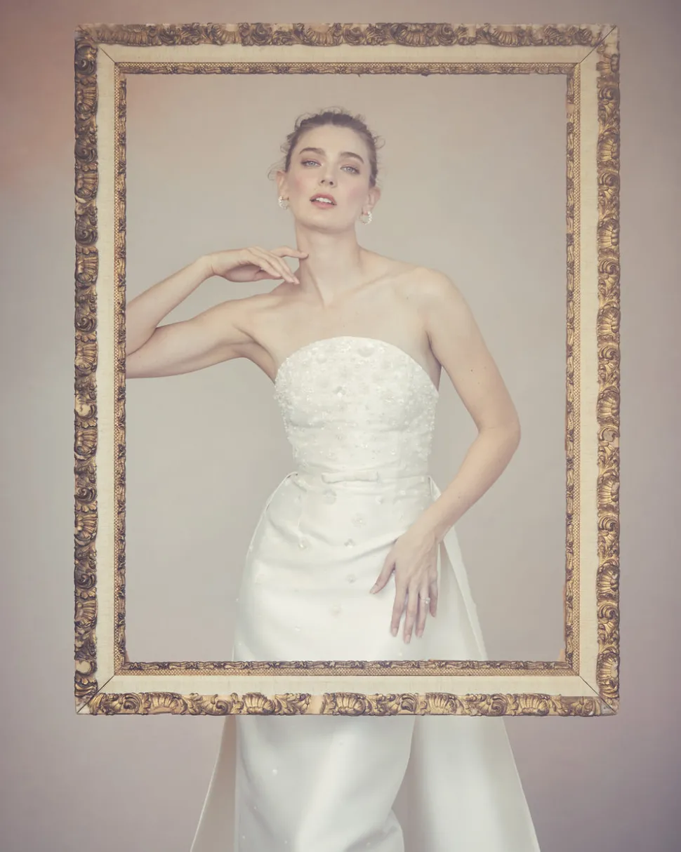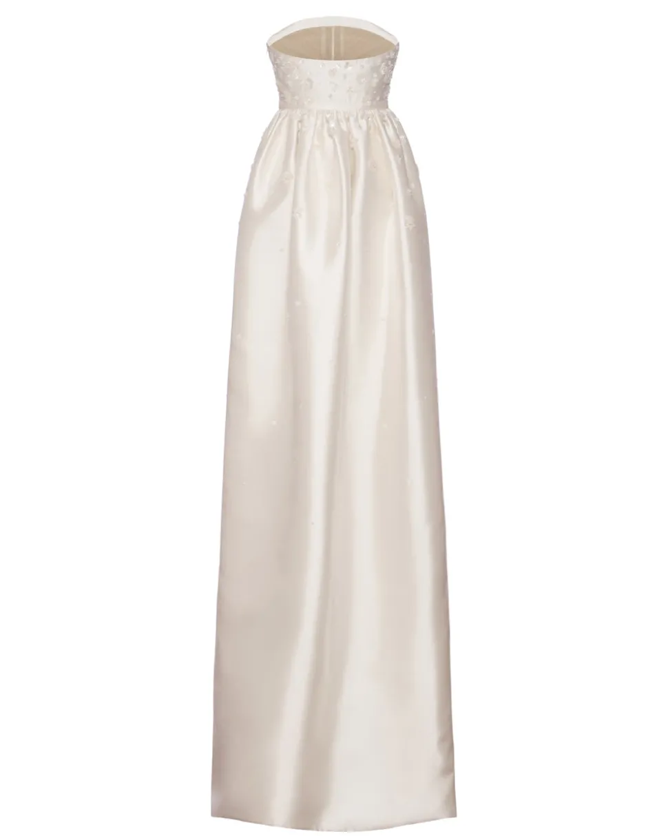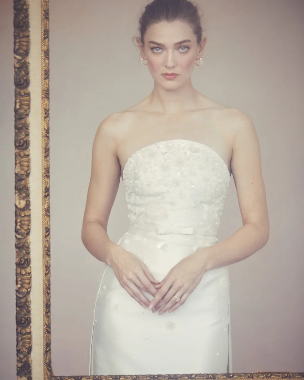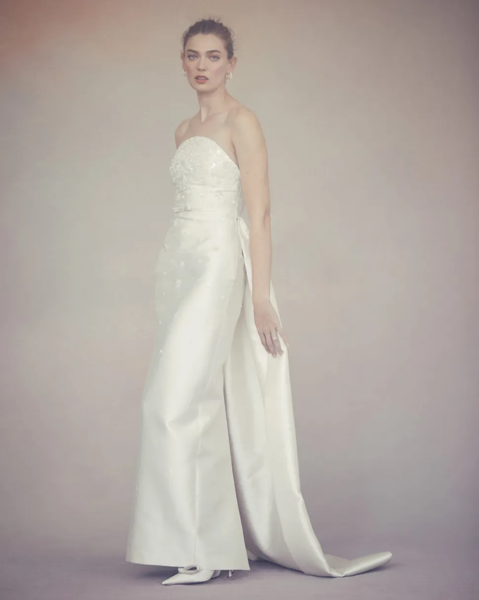 A graduate of the Savannah College of Design, award-winning Alexandra Pijut’s namesake line arrives from her studio in New York, offering luxe ready-to-wear pieces that distinguish themselves between femininity and practicality. With a soft, curved neckline, bow belt, and dramatic train, the Gabi Gown offers a sophisticated silhouette with elegant, intricate detailing. Cut from ivory silk wool and adorned with clusters of flowers, sequins, and beads, this statuesque style commands attention while remaining feminine and delicate. The curved neckline is supported by an interior corset.
