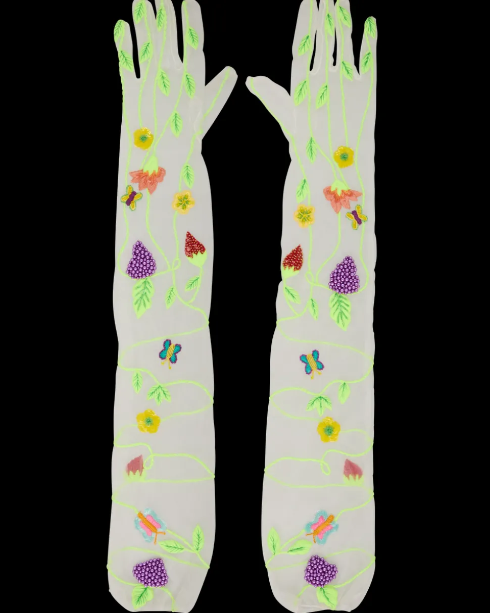 An Instagram and celebrity-favorite, Susan Alexandra’s carefully designed pieces bring whimsy to another level, and another world. Enter a youthful landscape of candy-colored jewelry, brightly beaded bags, as joy, fun, and fashion shine forth from every piece, and pop of color. Here, a fervent garden, replete with blossoms, grapes, strawberries, and verdant vines, is embroidered onto the chic, beaded Garden Gloves.