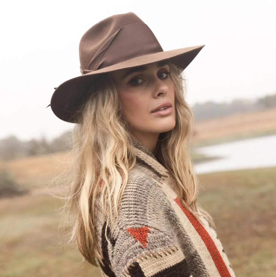 Founded, owned, and operated by women, Freya redefines the Panama hat with modernized silhouettes, UPF 50+ coverage, and organic materials. Embracing 3000 years of tradition, each piece is handcrafted with toquilla palm plant fibers by artisans in Northern Ecuador, and designed with a contemporary eye, resulting in stylish, versatile pieces made to last a lifetime. The Gardenia in Cocoa is a structured fedora accented by an oversized grosgrain ribbon, wrapped asymmetrically around the hat and finished with a modern, angular fold. A timeless, structured felt style, this piece adds understated sophistication to any look.