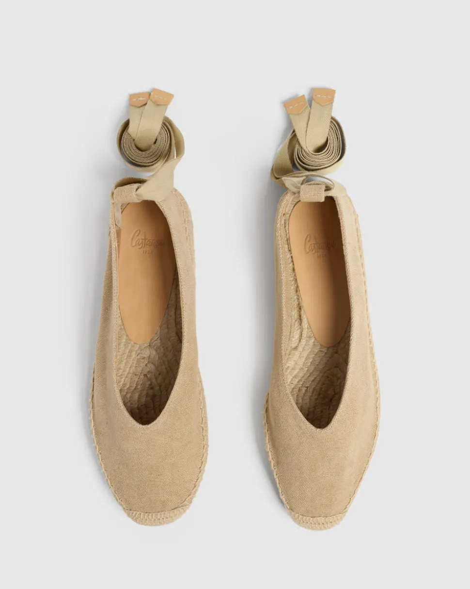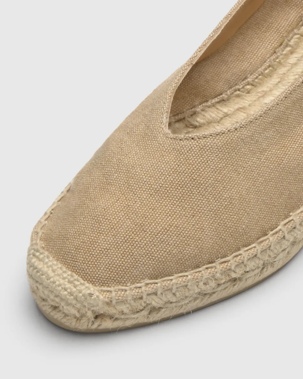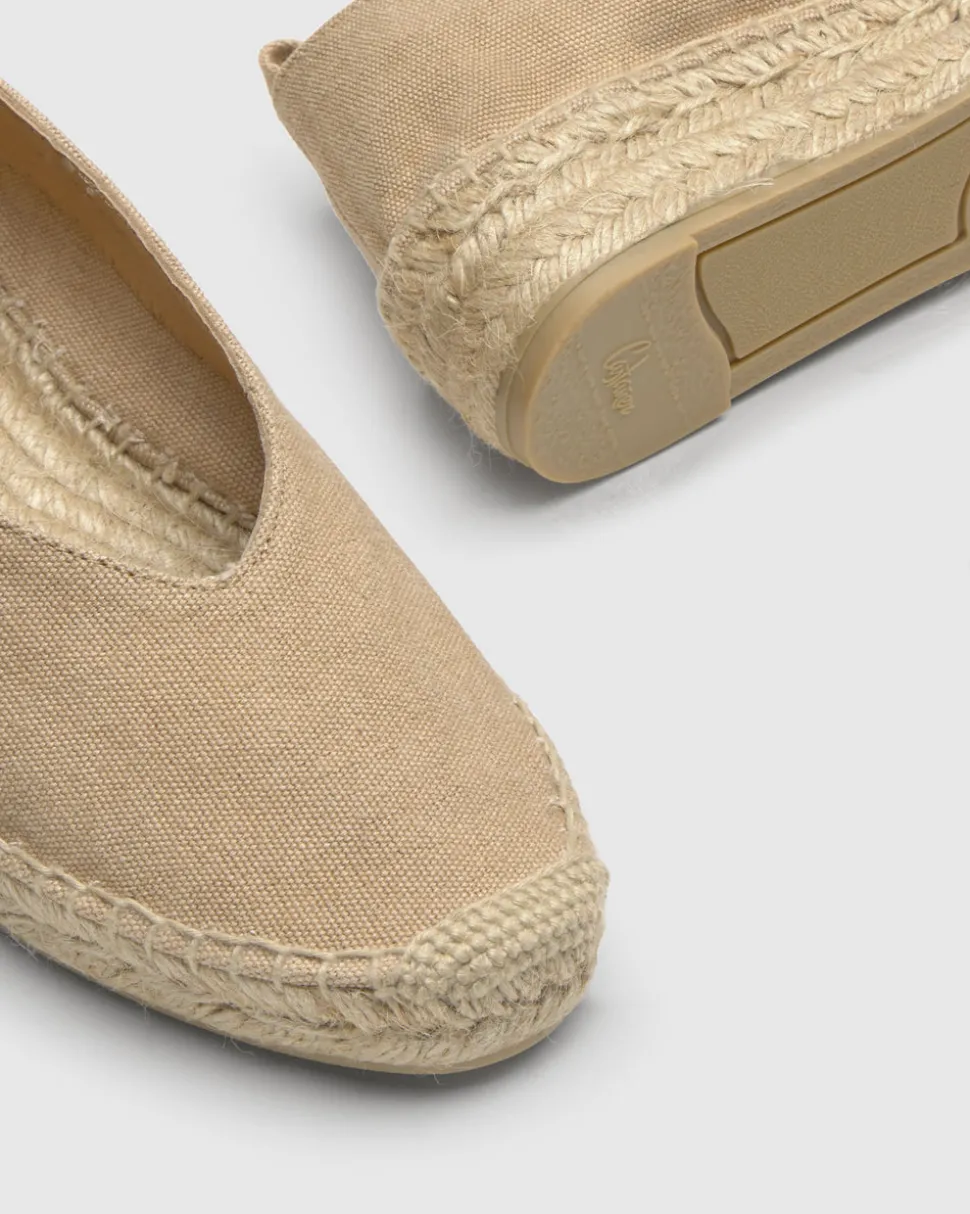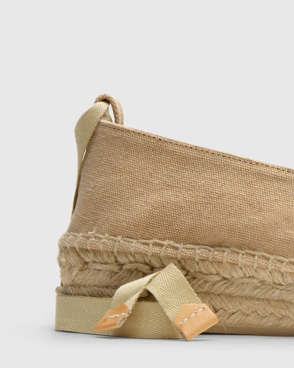 Founded in 1927, Castañer has elevated the espadrille into a sophisticated symbol of timeless design. With a commitment to craftsmanship, tradition, and natural materials, the brand continues to blend heritage with innovation, earning global recognition while staying true to its authentic roots. The Gea 2 in Sand Cotton is a versatile ballerina style espadrille in washed organic cotton with removable straps and a mini jute wedge.