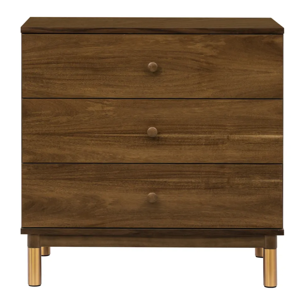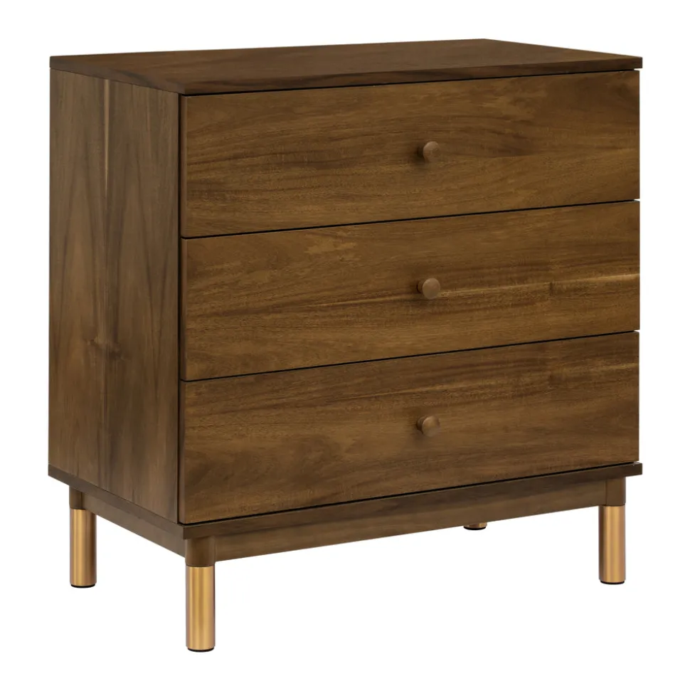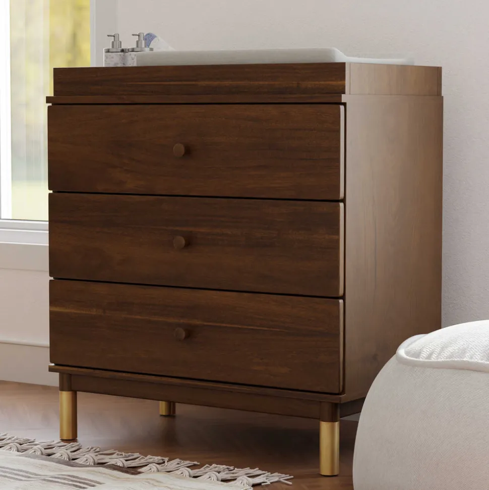 Natural walnut finish with brushed gold feet. Made from sustainably sourced New Zealand pine wood and TSCA-compliant engineered wood. GREENGUARD Gold Certified. Includes three spacious drawers with smooth metal glides and stop mechanisms. Removable changing tray included.