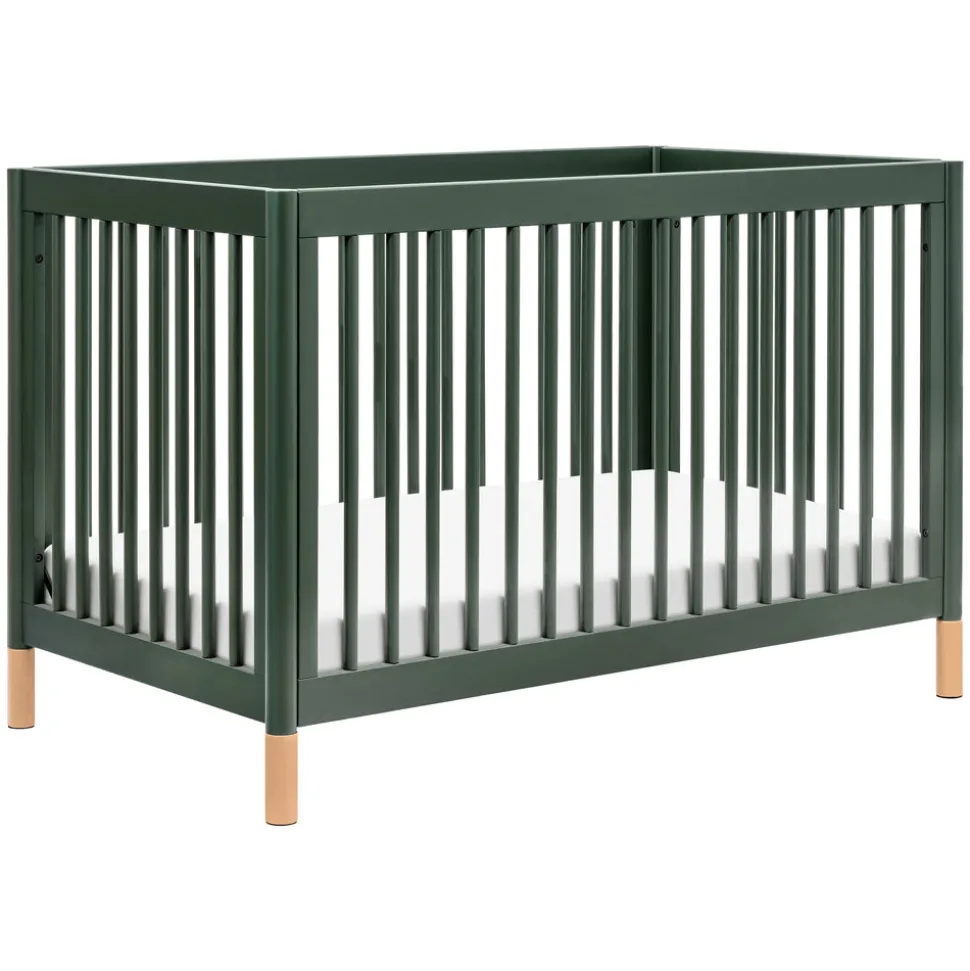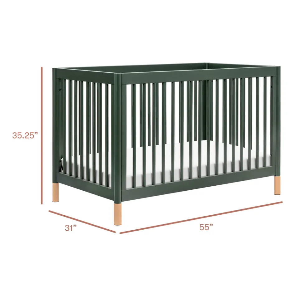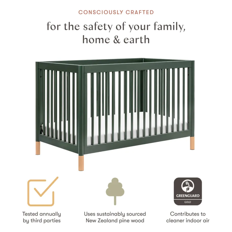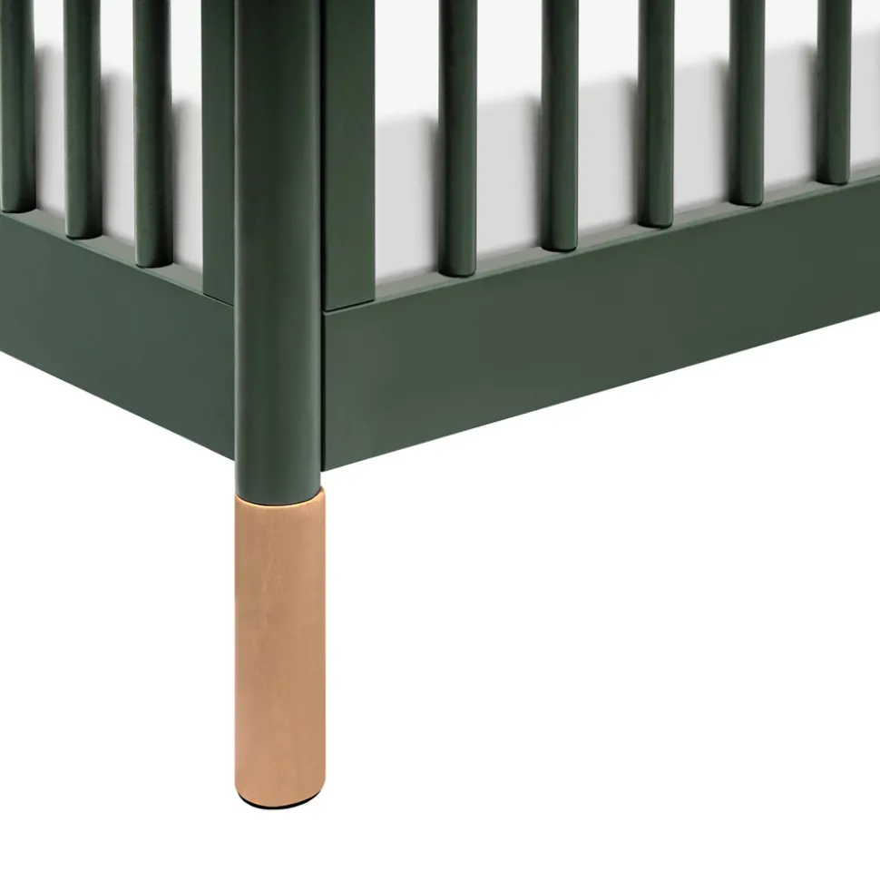 Forest Green finish with vegan blonde leather feet. Made with FSC® Certified sustainable New Zealand pine wood. Includes toddler bed conversion kit. GREENGUARD Gold Certified for cleaner indoor air. Converts from crib to toddler bed to daybed, with optional full-size conversion kit sold separately.