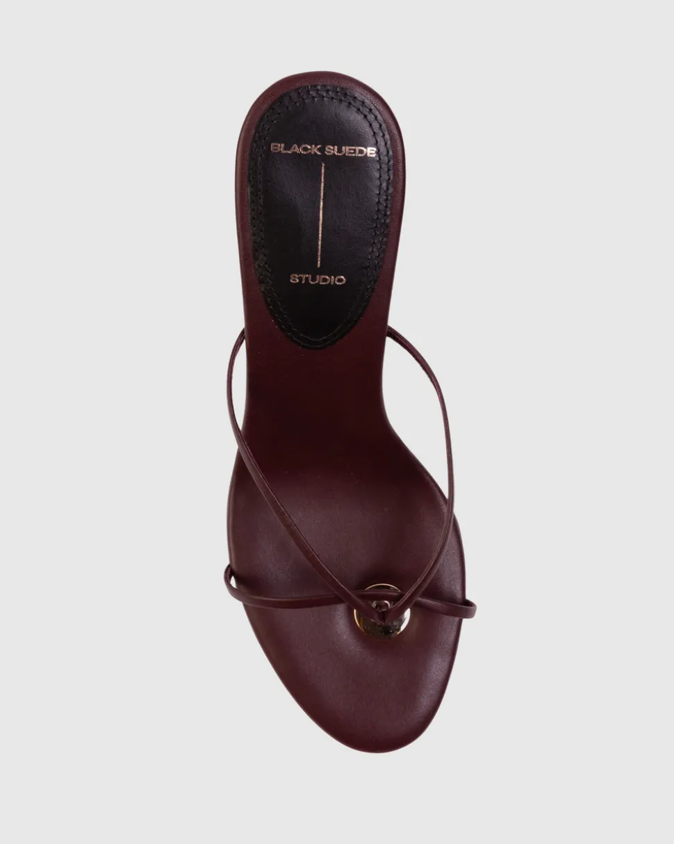 Founded by Kris Avakia in Montréal, Black Suede Studio fuses heritage, passion, and fine craftsmanship to form a line of forward-thinking, luxury footwear. The Gem 65 in Bordeaux Leather is a round toe thong slipper mule, crafted in smooth buffed leather and accented with a gold medallion at the toe post. Set on a straight mid-height heel, this sleek silhouette pairs timeless elegance with a bold, modern edge.