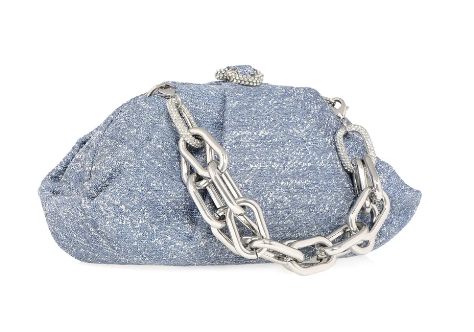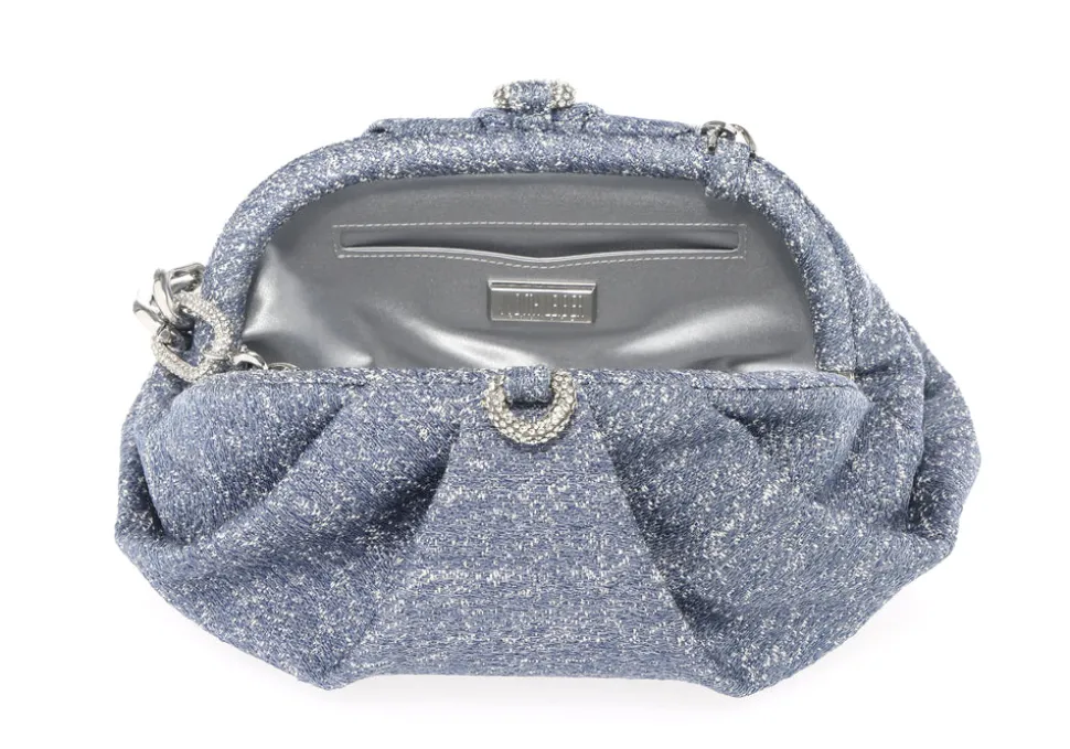 Crystal-embellished denim minaudière. Metallic leather lined interior. Crystal inset push down closure. Silver toned metal hardware. Removable classic elbow chain. Made in Italy.