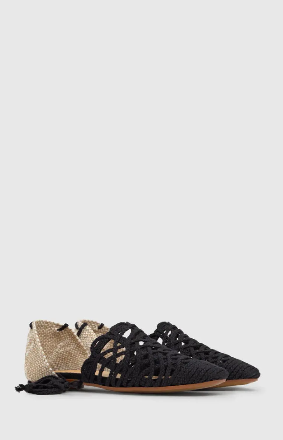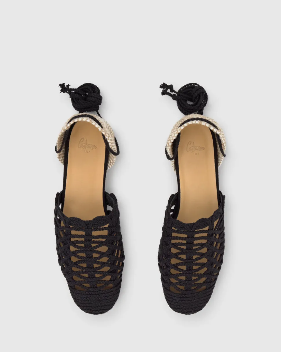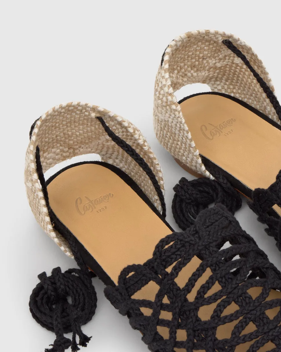 Founded in 1927, Castañer has elevated the espadrille into a sophisticated symbol of timeless design. With a commitment to craftsmanship, tradition, and natural materials, the brand continues to blend heritage with innovation, earning global recognition while staying true to its authentic roots. The Genoveva flat espadrille in black features hand-braided cotton with matching lace-up closure and a cushioned insole. This elegant design combines artisanal craftsmanship with breathable comfort for a refined everyday style.