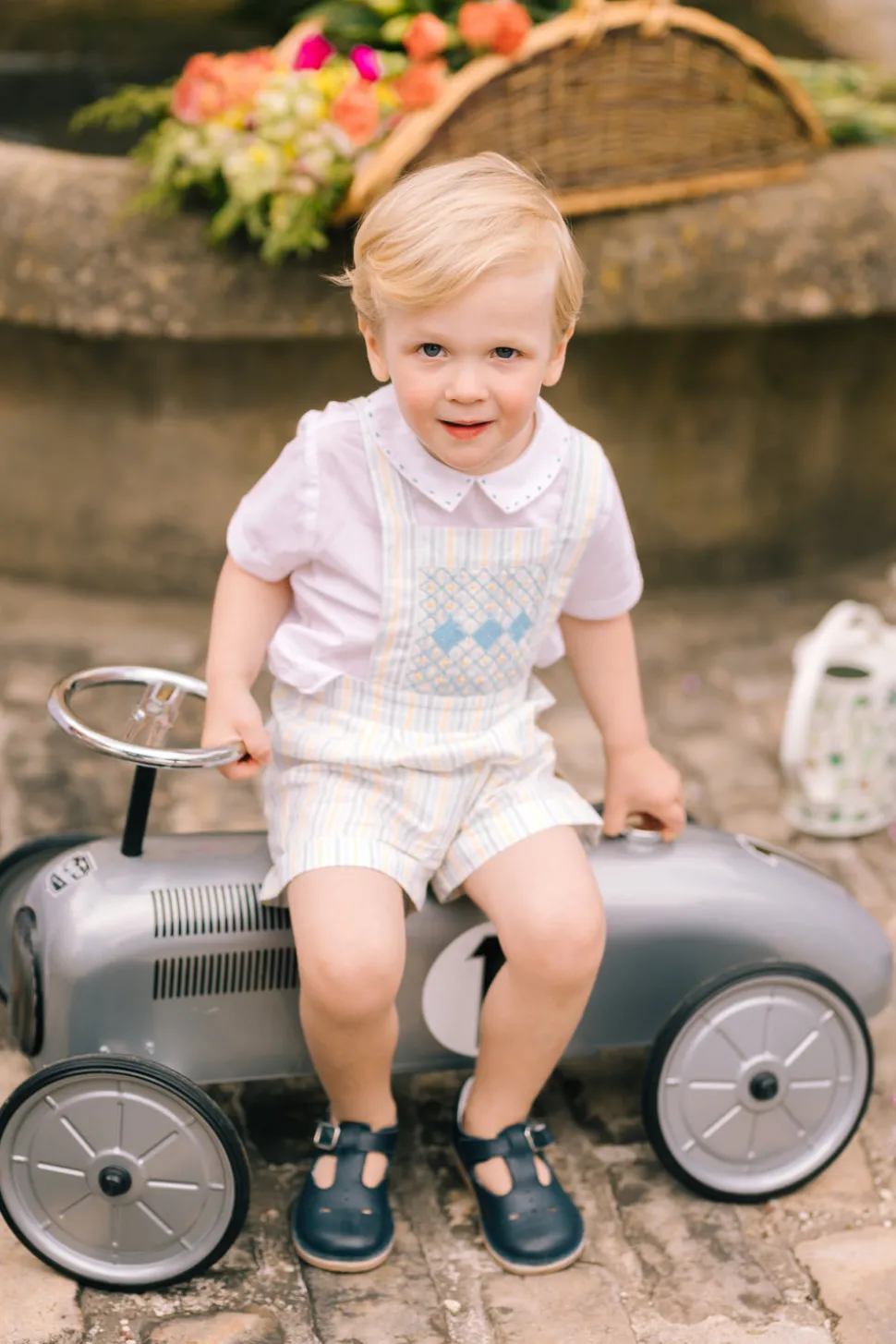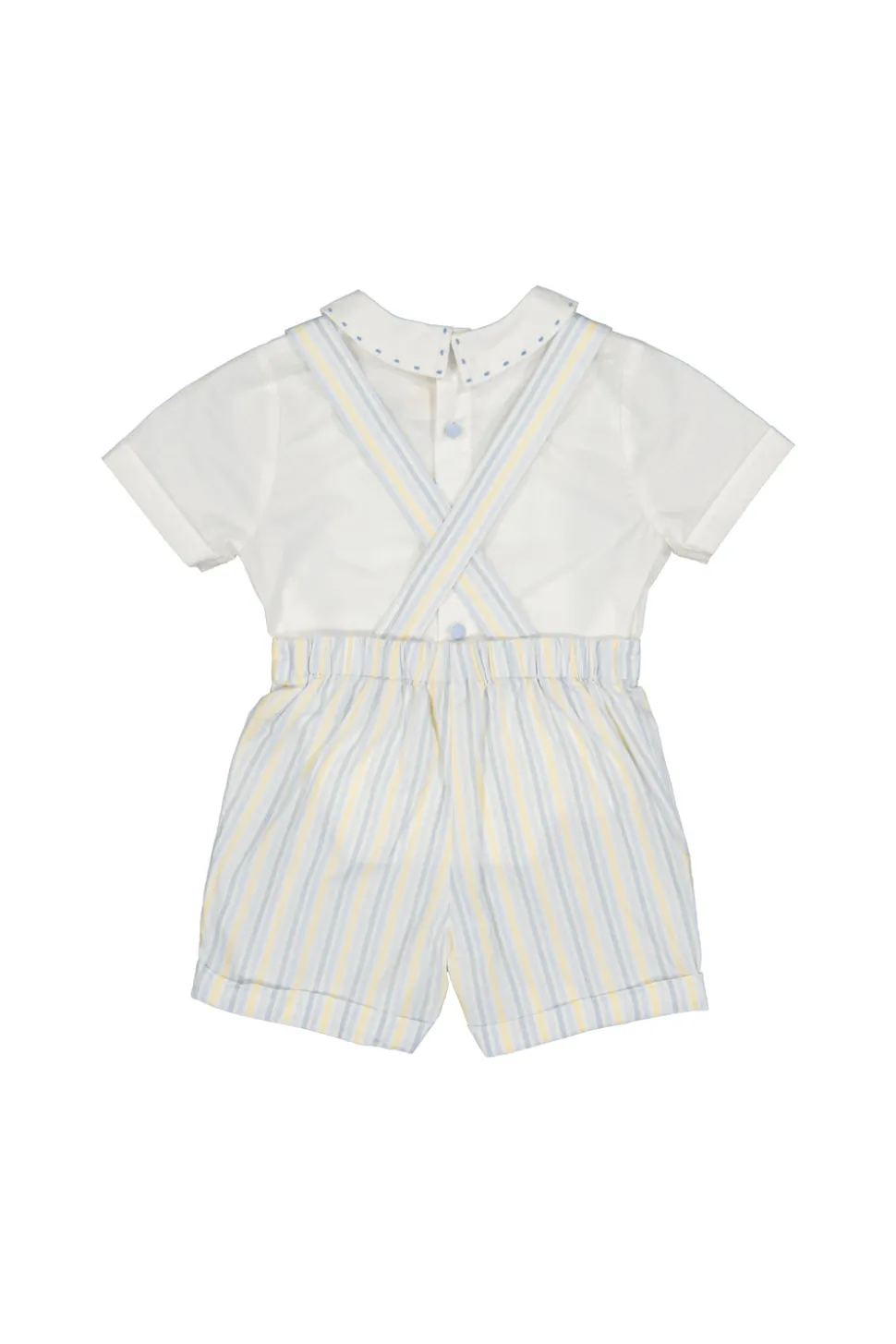 Antoinette Paris creates elegant, handmade garments for little girls, designed in Paris with sophisticated, refined, and exclusive “Haute Couture” details. Their collections include dresses, dungarees, and bubbles, available from birth to 10 years old, made for any occasion and tailored for a new generation of children. The classically preppy George Yellow Blue Stripe Overalls and Shirt, with delicate blue and yellow stripes and hand-embroidered geometric details, evoke a touch of heritage charm. Paired with a crisp white shirt featuring embroidery on the collar, this look is as effortless as it is elegant. Pairs beautifully with the Capucine smocked Dress for adorable sibling matching outfits.