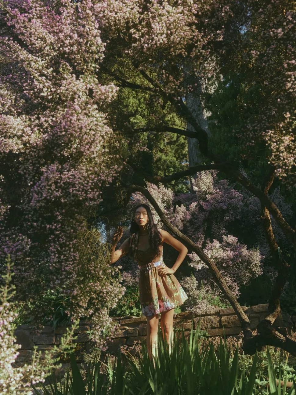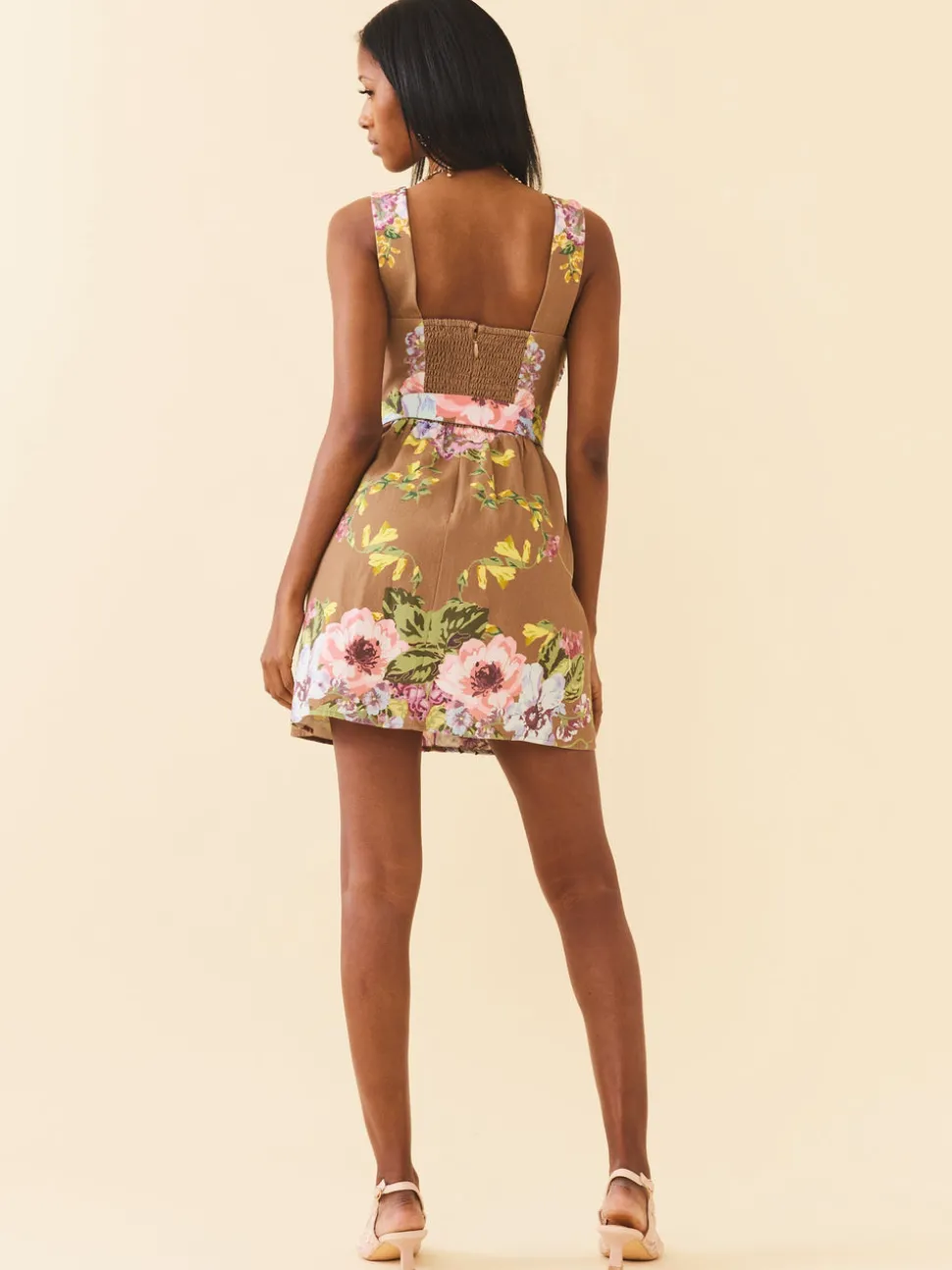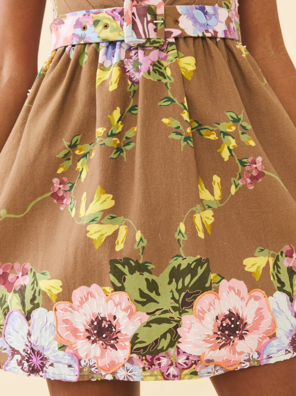 Tomboy looks, girly-girl styles, and an always fashionable approach define EDDY’s aesthetic. With a focus on bold and feminine silhouettes, EDDY dresses and tops pair elevated California bohemian with global inspiration; these are clothes designed to make you feel good inside and out. The Georgie Dress in Caramel Victorian Floral features a structured sweetheart bodice, wide straps, and a waist-cinching floral belt that keeps it romantic, while the leggy hemline and painterly blooms make it anything but basic.