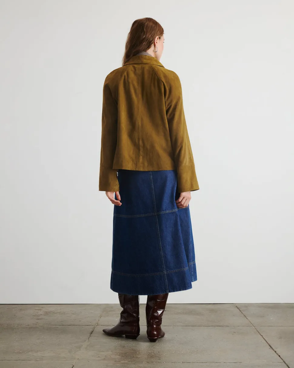 Creating clothing that inspires confidence, celebration, and community, Tanya Taylor is a New York-based womenswear brand whose mission is to provide practicality and style to a range of ready-to-wear in inclusive sizes. Each collection is thoughtfully designed through the artful use of color, texture, and original hand-painted prints. The Gidget Jacket in Olive offers a modern take on classic outerwear, designed in rich suede with an effortlessly cool sensibility. Featuring a button-front closure, straight silhouette, and functional pockets, it’s an easy layering piece that adds a grounded edge to fall dressing.