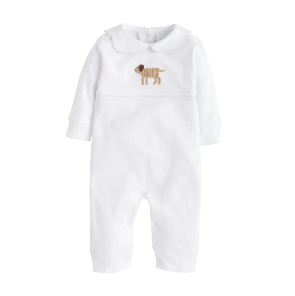 Shannon Latham founded Little English in 2004 with the belief that children should always be well-dressed. Employing hand-smocking, hand-embroidery, and the very best fabrics, Shannon and her daughter design timeless pieces that will be worn for generations to come. Classically knit by hand, the Girl Lab Crochet Playsuit is crafted from the softest white pima cotton and trimmed in pink picot. Both baby and parents will love the doggy detail, not to mention the darling peter pan collar.