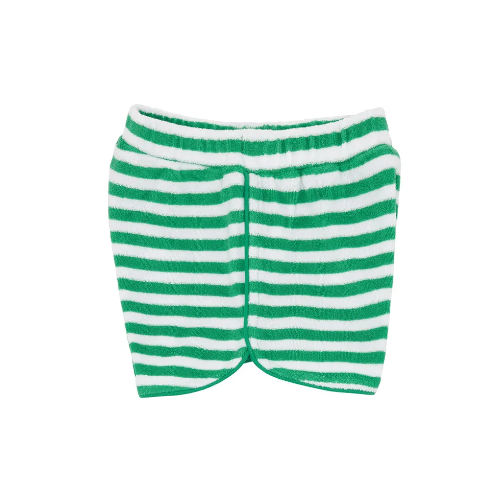 A family favorite for its clean lines and simple details, minnow creates pieces that are playful, polished, and thoughtfully designed for long days, sandy toes, and the wonderment of life on the shore. The elevated Girls Bermuda Green Stripe French Terry Short will seamlessly transition from post-swim to playtime. This bestseller designed in premium french terry with a relaxed fit. Features an elastic waist for ultimate comfort and sweet contract piping along the hem.