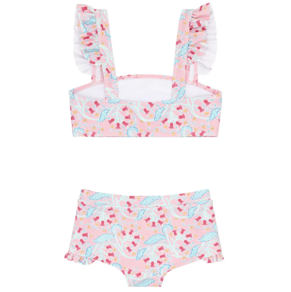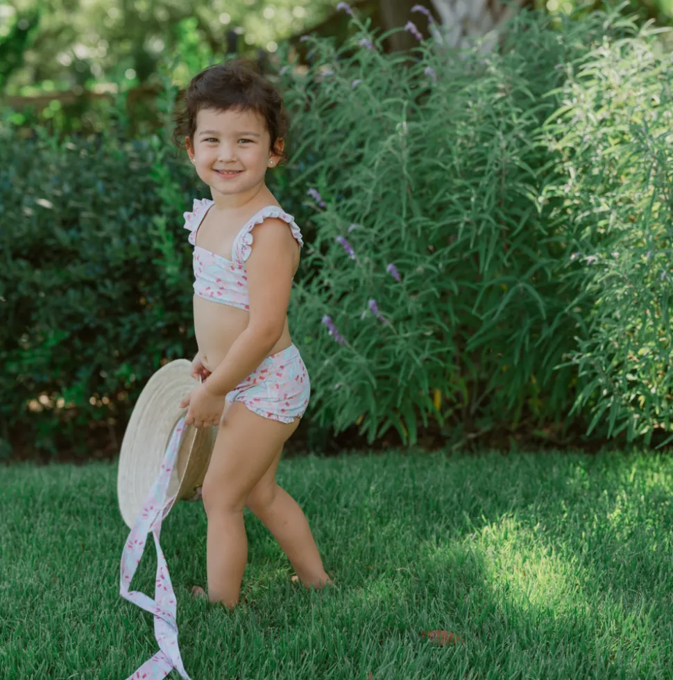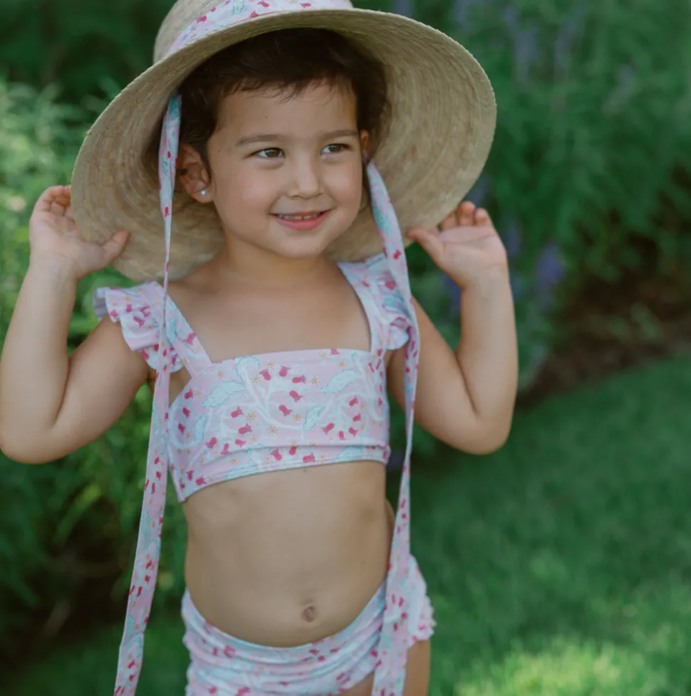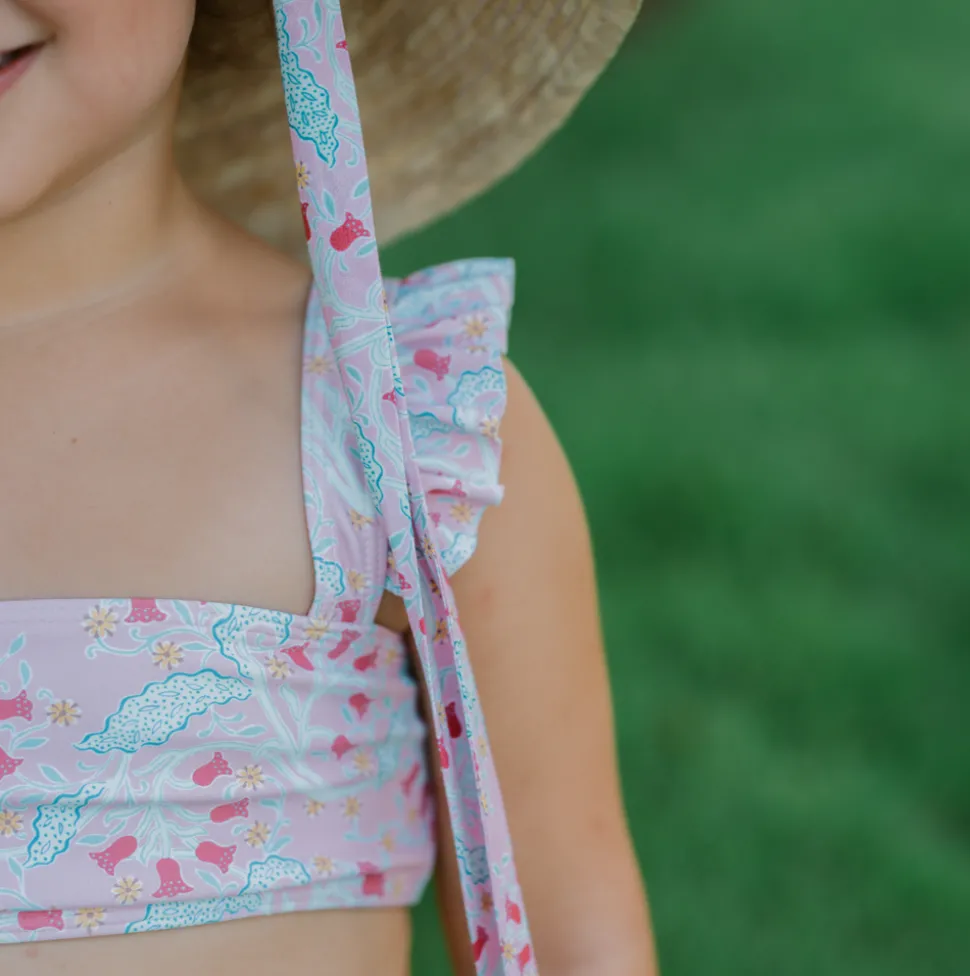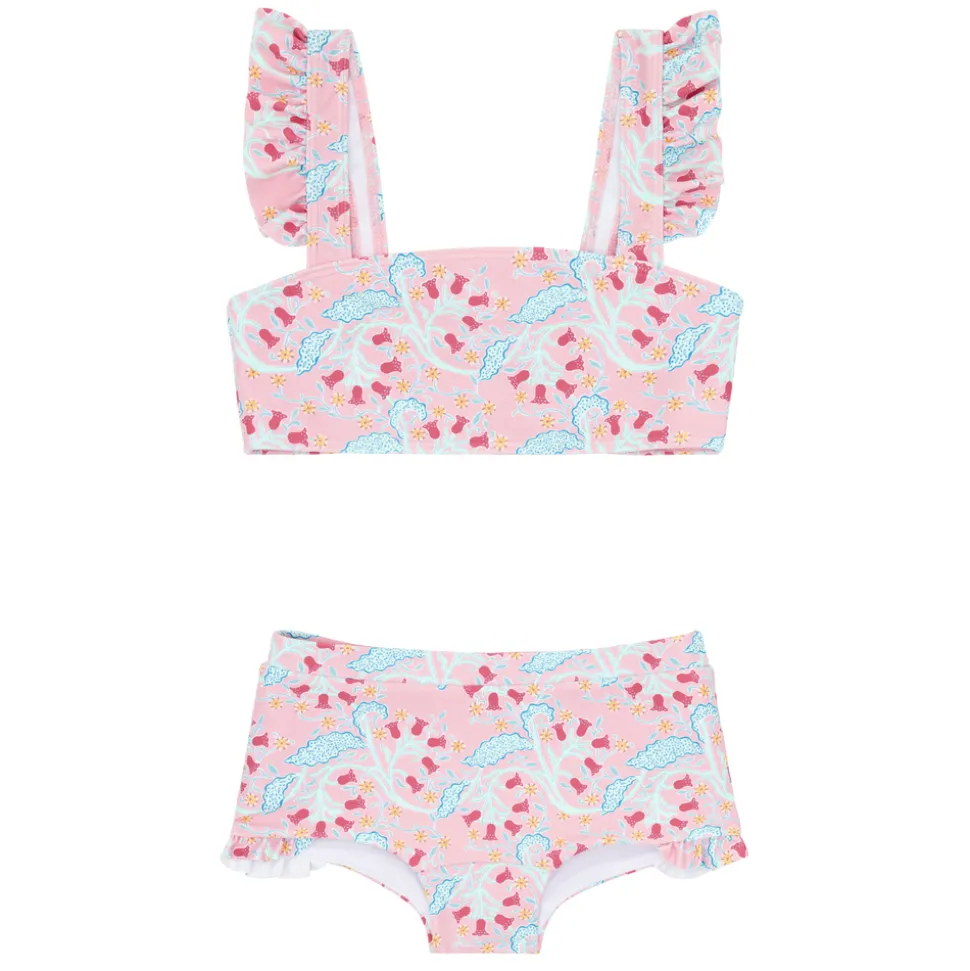 A family favorite for its clean lines and simple details, minnow creates pieces that are playful, polished, and thoughtfully designed for long days, sandy toes, and the wonderment of life on the shore. The Girls Bluebells Bandeau Bikini And Swim Shorts feature an exclusive print designed by artist Ellen Merchant. The flattering bandeau top with matching swim shorts are made for movement—and great for long days in and out of the water.