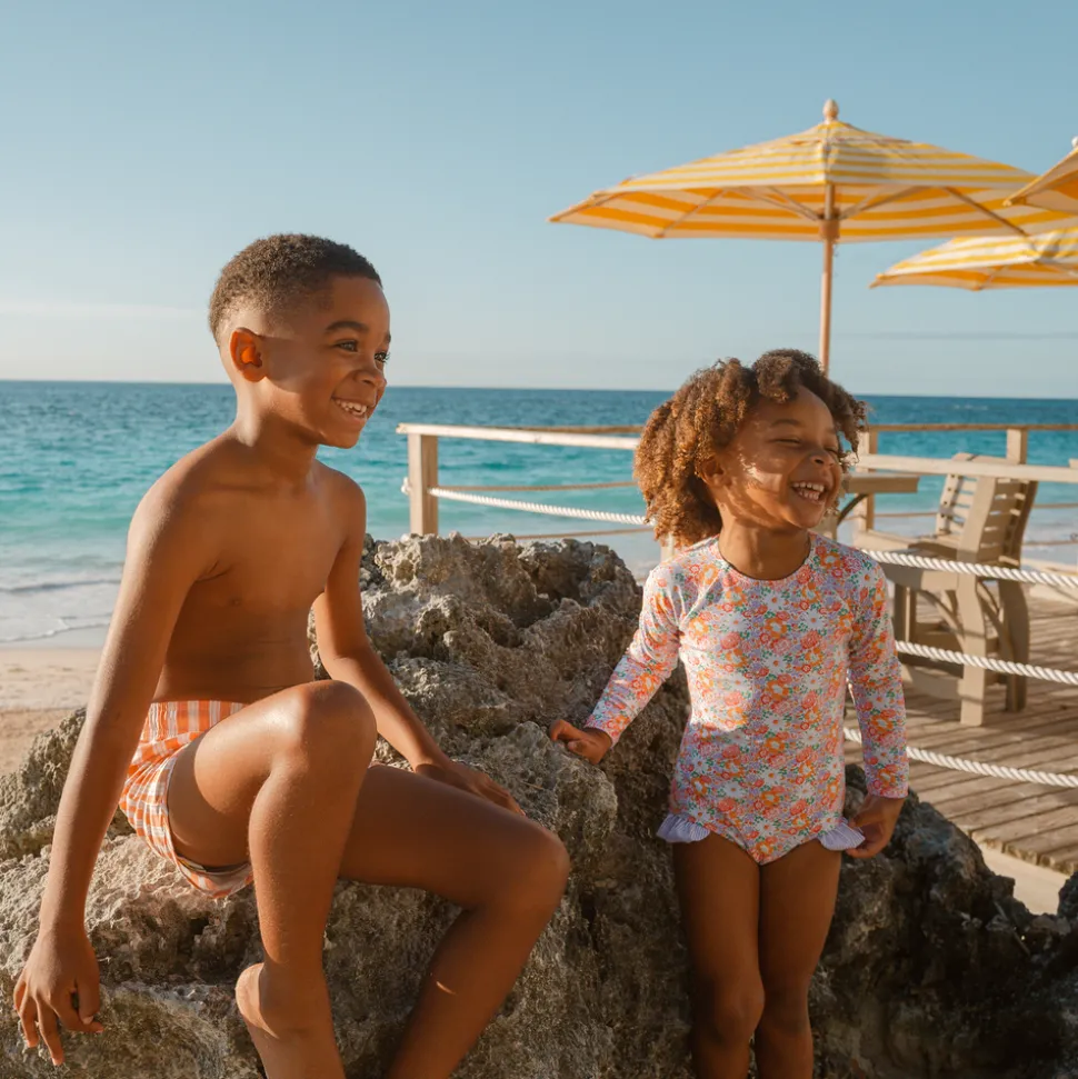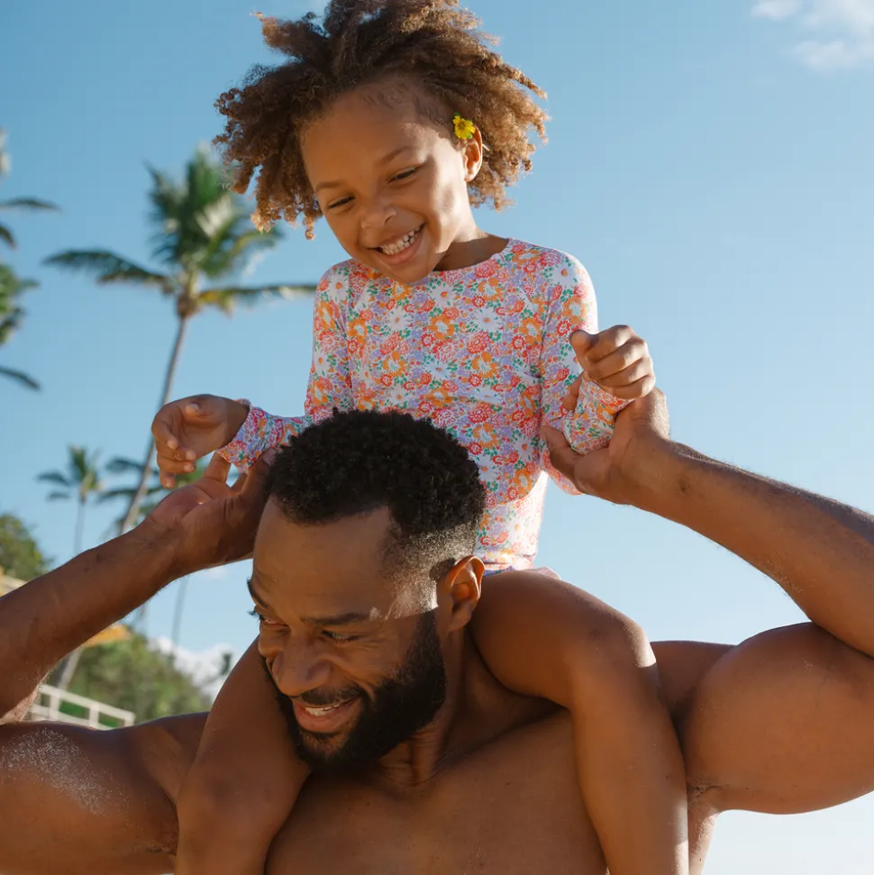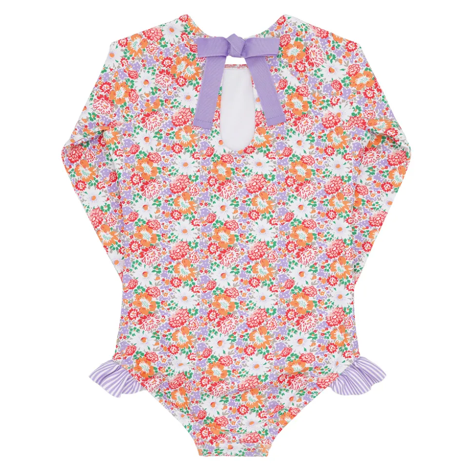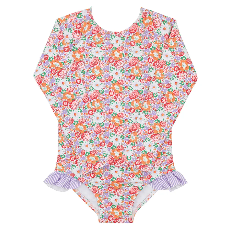 A family favorite for its clean lines and simple details, minnow creates pieces that are playful, polished, and thoughtfully designed for long days, sandy toes, and the wonderment of life on the shore. The Girls Island Blossom Rashguard One Piece features sun-safe grosgrain ribbon back tie is fixed with a hidden button closure for easy changes. Designed in a soft and stretchy textured fabric, with the feminine ruffles details, this comfortable staple is oh-so sweet.