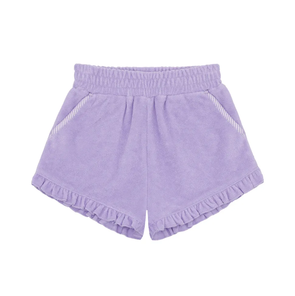 A family favorite for its clean lines and simple details, minnow creates pieces that are playful, polished, and thoughtfully designed for long days, sandy toes, and the wonderment of life on the shore. The Girls Lavender Breeze French Terry Shorts offer an elevated take on a European-style resort staple, designed in premium French terry for all-day comfort. Featuring an elastic waistband, ruffle accents, and contrast piping at the pockets, this relaxed-fit short transitions effortlessly from poolside to playtime.