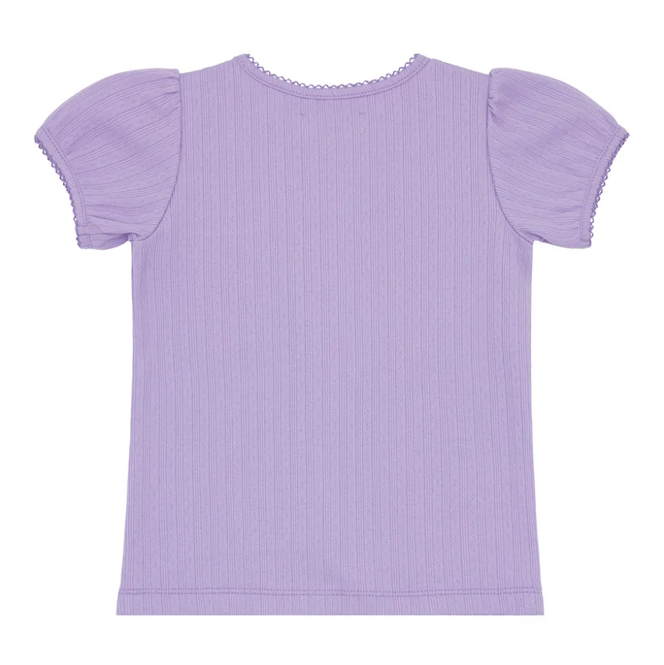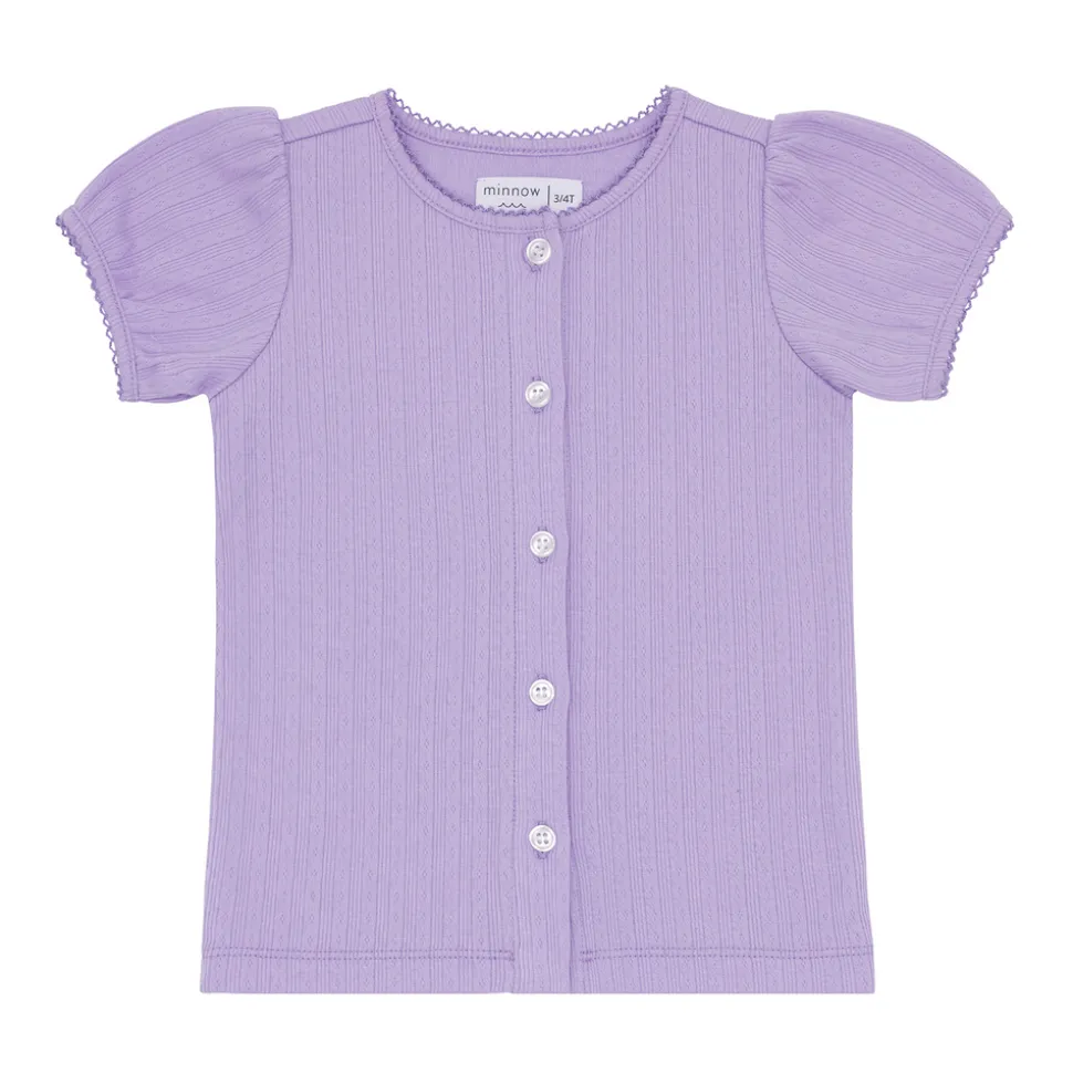 A family favorite for its clean lines and simple details, minnow creates pieces that are playful, polished, and thoughtfully designed for long days, sandy toes, and the wonderment of life on the shore. The Girls Lavender Breeze Puff Sleeve Shirt is crafted from the softest pointelle cotton and finished with delicate picot trim at the collar and sleeves. With its gently puffed sleeves and versatile shape, this style pairs beautifully with coordinating shorts or layered under a breezy dress.