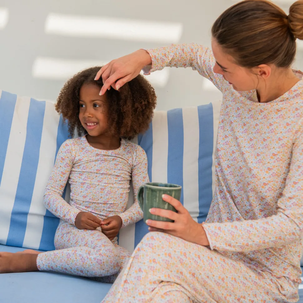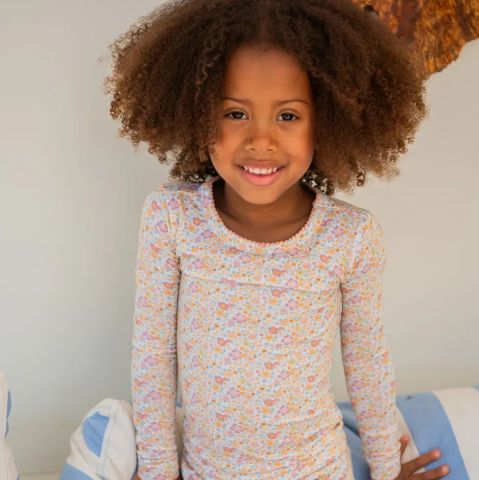 A family favorite for its clean lines and simple details, minnow creates pieces that are playful, polished, and thoughtfully designed for long days, sandy toes, and the wonderment of life on the shore. The Girls Marigold Floral Pima Pajamas Set features a long sleeve top and pants with delicate picot trim. Extremely soft and lightweight, the buttery pima cotton and modal blend provides subtle stretch for the perfect true to size fit. This easy set will go from sleep to swim in a breeze.