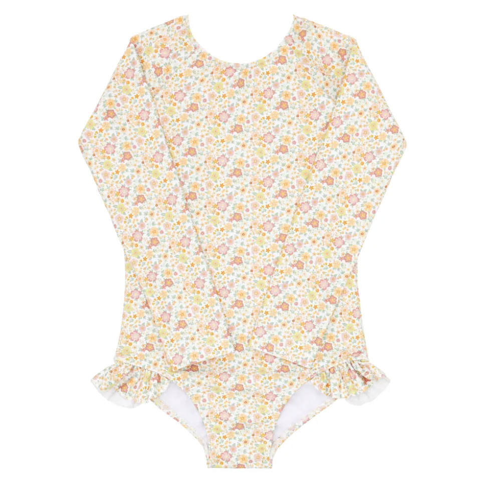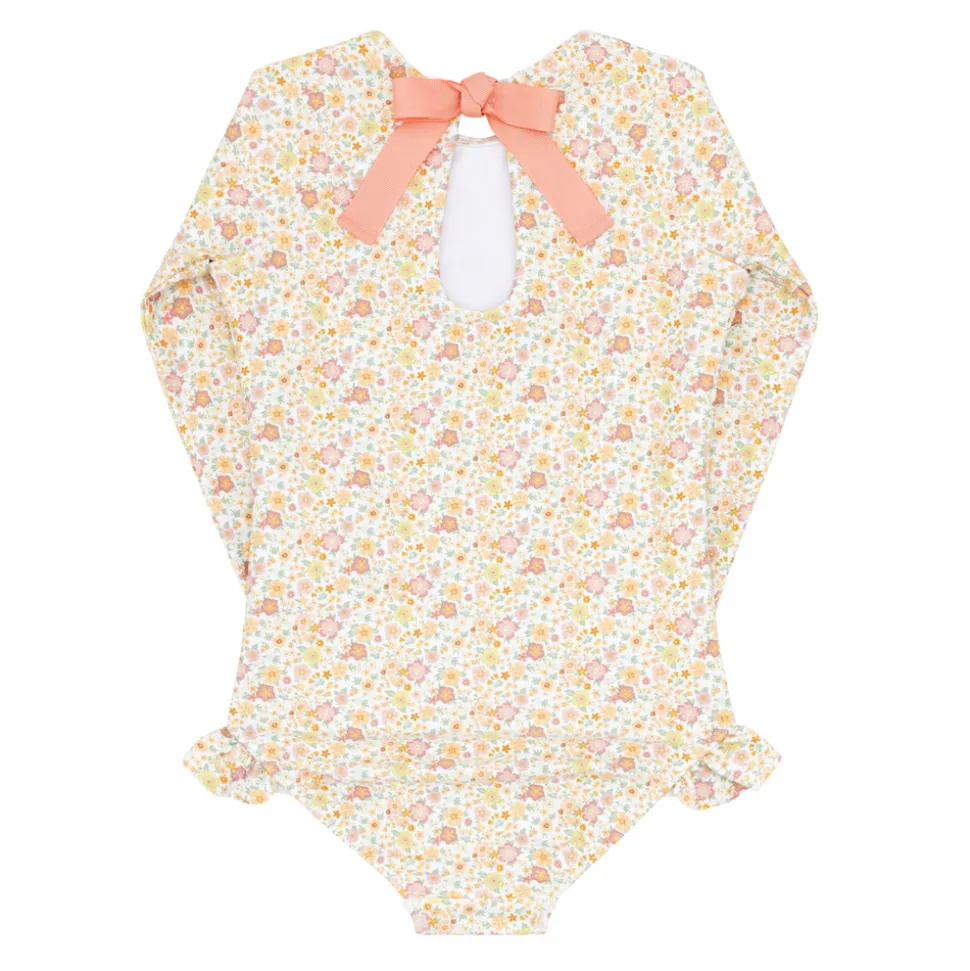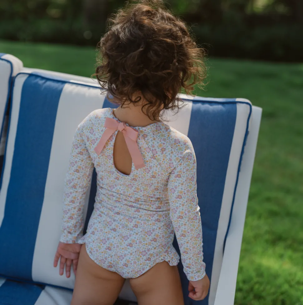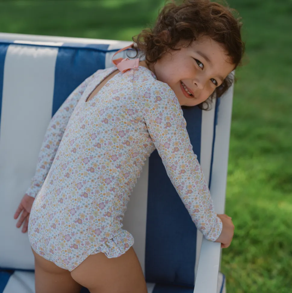 A family favorite for its clean lines and simple details, minnow creates pieces that are playful, polished, and thoughtfully designed for long days, sandy toes, and the wonderment of life on the shore. The Girls Marigold Floral Rashguard One Piece is sun-safe and features grosgrain ribbon back tie is fixed with a hidden button closure for easy changes. The feminine ruffle hip detail makes this comfortable staple oh-so sweet.