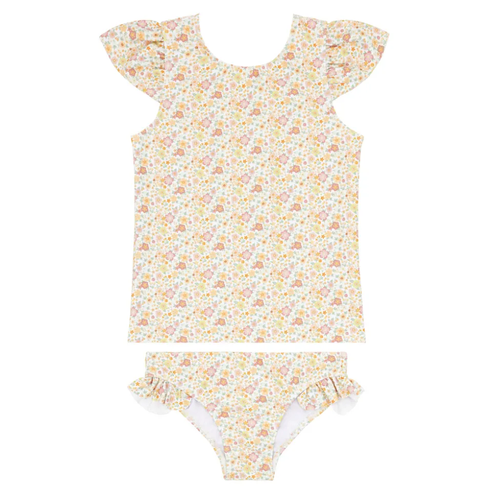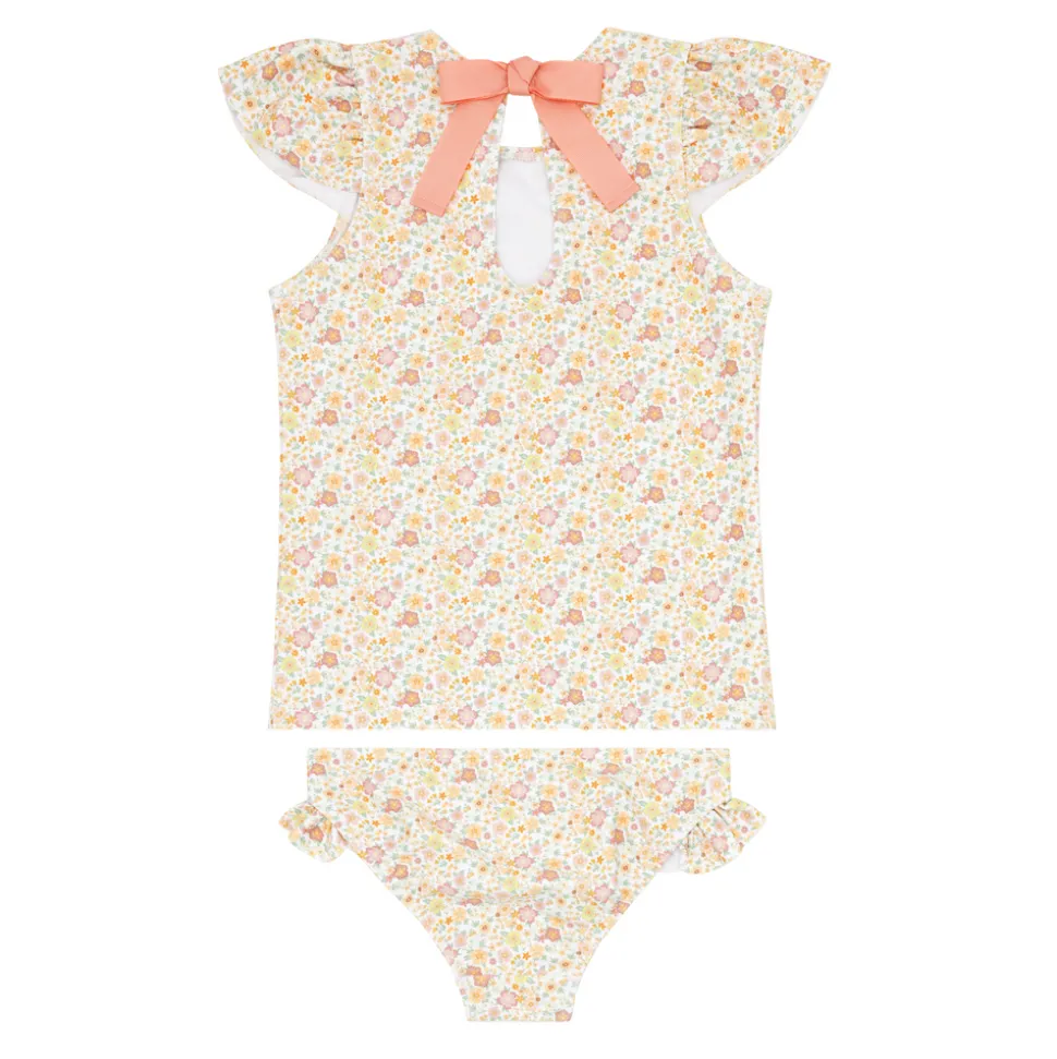 A family favorite for its clean lines and simple details, minnow creates pieces that are playful, polished, and thoughtfully designed for long days, sandy toes, and the wonderment of life on the shore. The Girls Marigold Floral Short Sleeve Cup Sleeve Rashguard Set is an adorable set with a sweet top with exaggerated cap sleeves paired with the signature bikini bottoms. A comfortable sun coverage option designed for all day play.