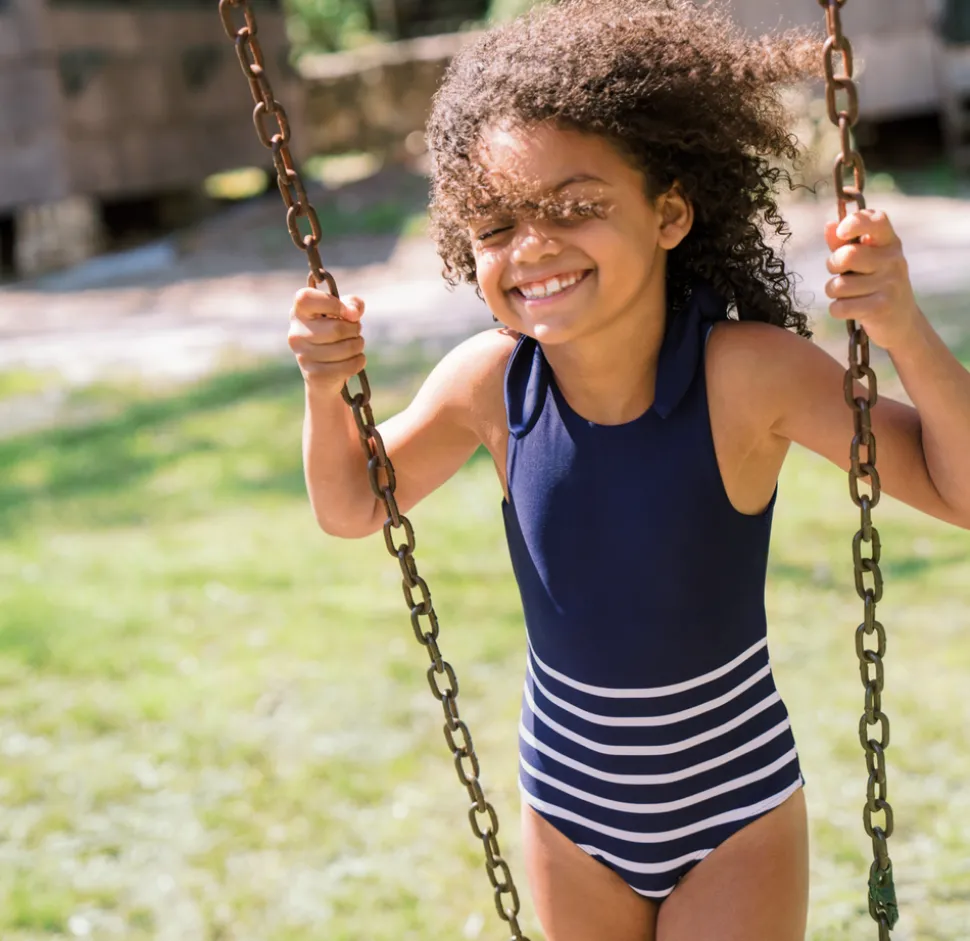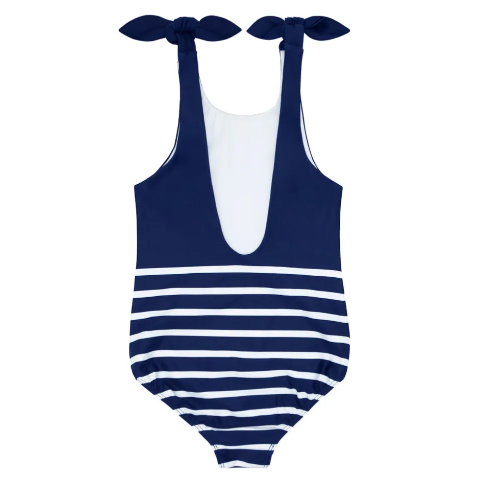 A family favorite for its clean lines and simple details, minnow creates pieces that are playful, polished, and thoughtfully designed for long days, sandy toes, and the wonderment of life on the shore. The Girls Navy Breton Stripe Tie-Knot One Piece is an elevated take on timeless swimwear, featuring a scoop back and exaggerated, adjustable shoulder ties for a comfy fit. Super cute and functional, in and out of the water.