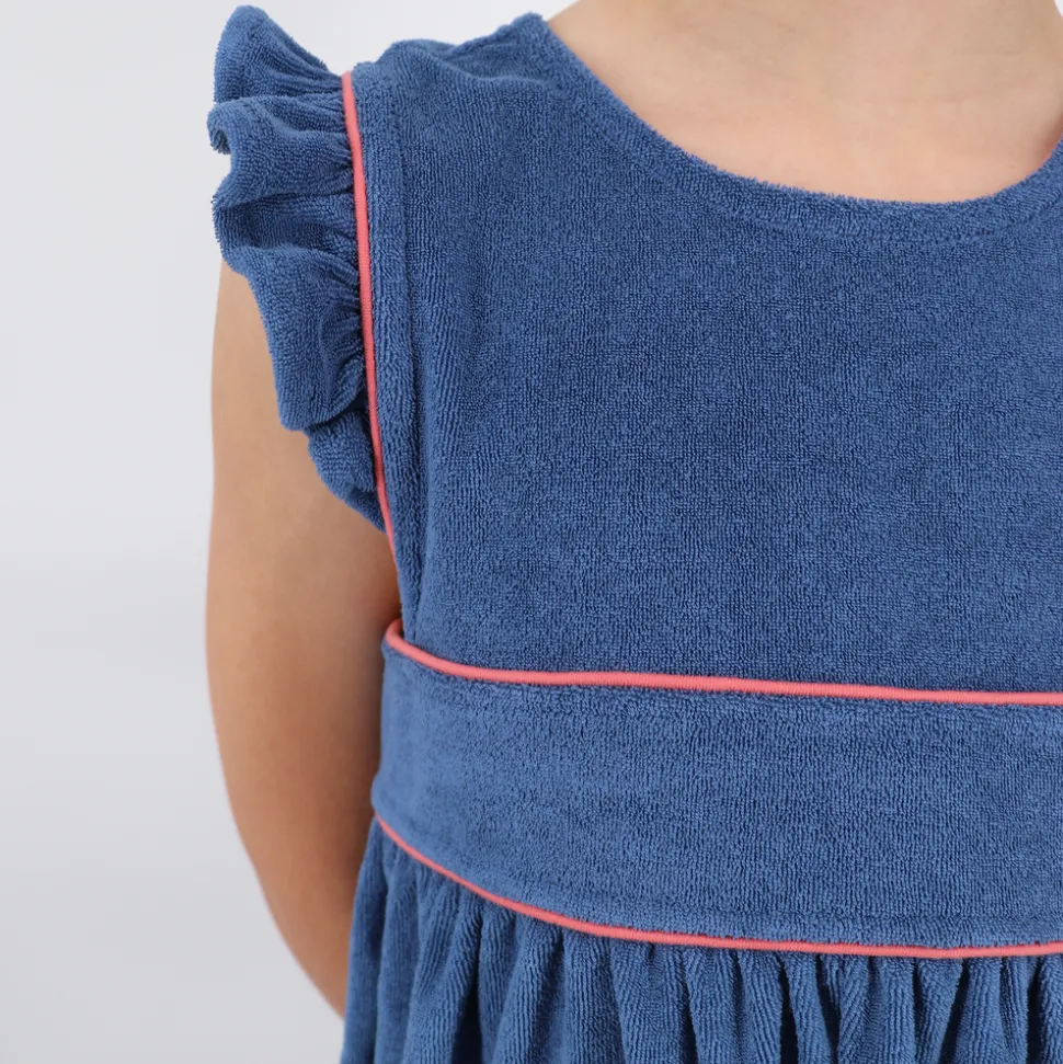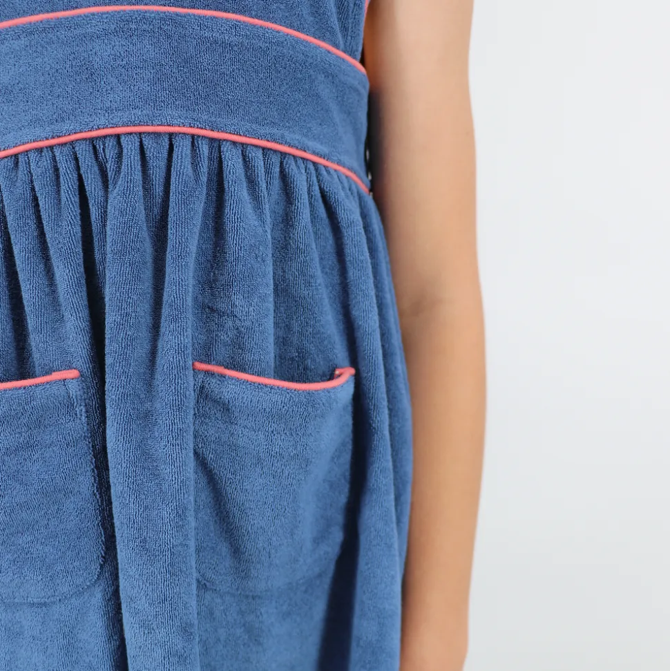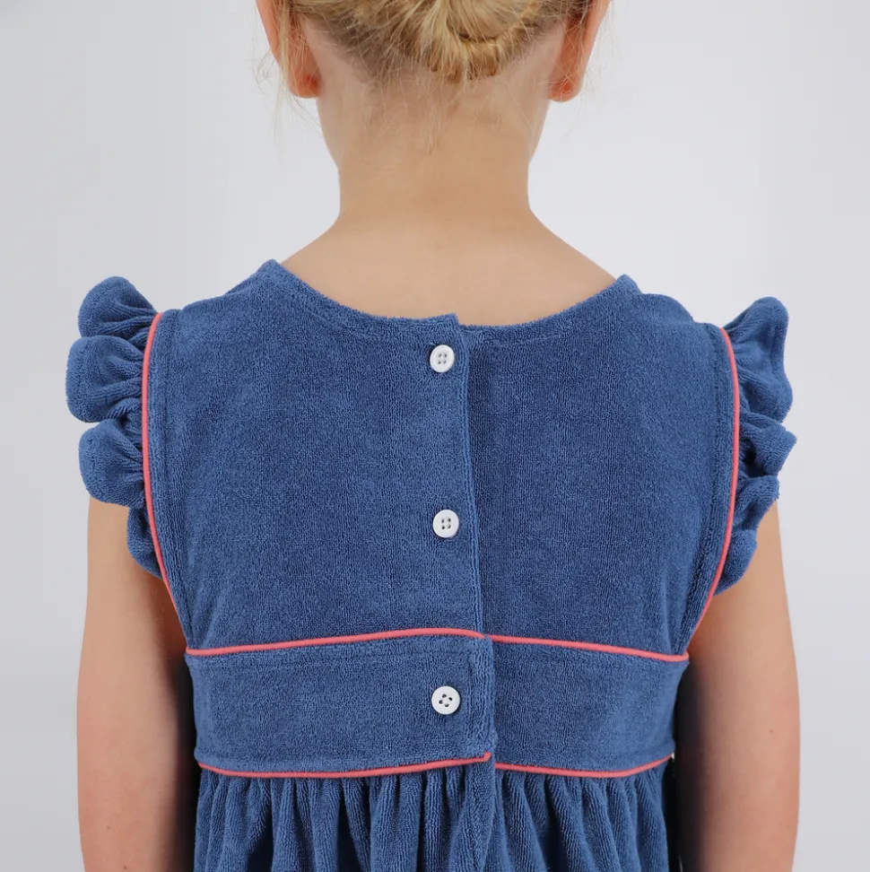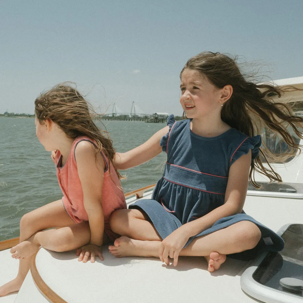 A family favorite for its clean lines and simple details, minnow creates pieces that are playful, polished, and thoughtfully designed for long days, sandy toes, and the wonderment of life on the shore. The Girl’s Newport Navy French Terry Pinafore Dress is part of the Minnow x Over the Moon limited-edition capsule—blending classic charm with everyday ease. Made from super-soft French terry, this nostalgic style features ruffle sleeves, patch pockets, and a relaxed silhouette that layers beautifully over a swimsuit or tee.