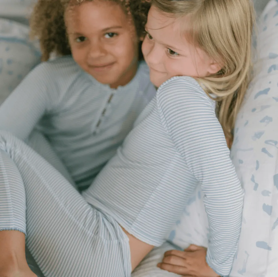 A family favorite for its clean lines and simple details, minnow creates pieces that are playful, polished, and thoughtfully designed for long days, sandy toes, and the wonderment of life on the shore. Cozy, comfy and cute as can be, they won’t ever want to take off the Girls Powder Blue Stripe Pima Pajamas Set. Crafted with a delicate picot trim, they’re made in a soft pima cotton blend for a luxe feel and a little stretch. What a dream.