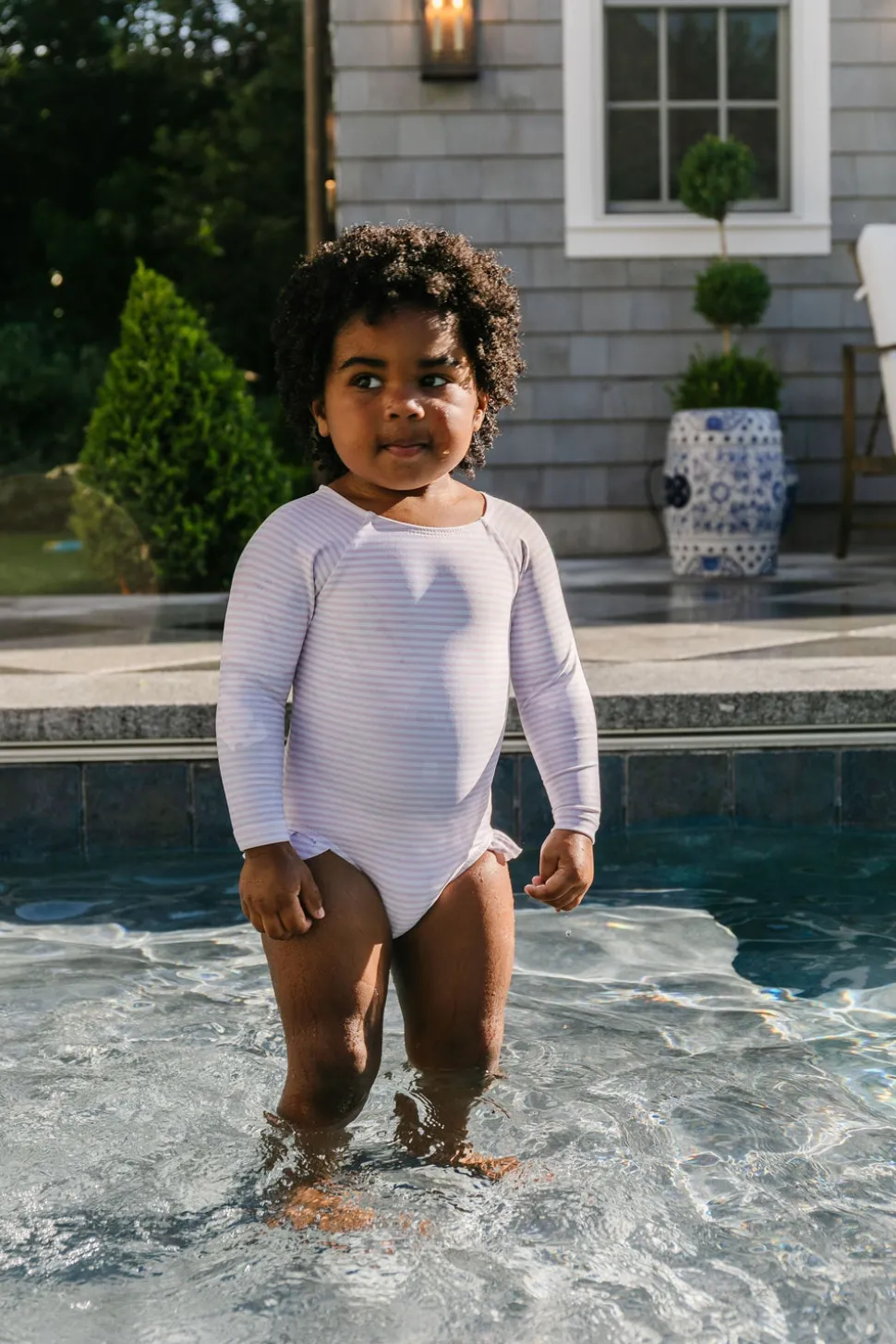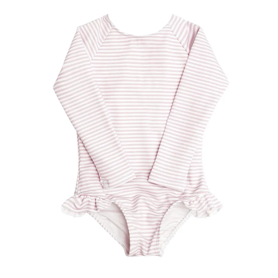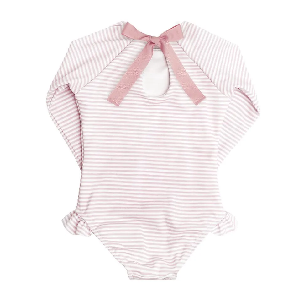A family favorite for its clean lines and simple details, minnow creates pieces that are playful, polished, and thoughtfully designed for long days, sandy toes, and the wonderment of life on the shore. The Girls Rashguard One-Piece in Light Pink Stripe offers full UPF 50+ protection. Lined along the torso and legs for maximum coverage and comfort, the raglan arms remain unlined and lightweight. Complete with a grosgrain ribbon back, the swimsuit features buttery soft fabric in a floral or stripe pattern.