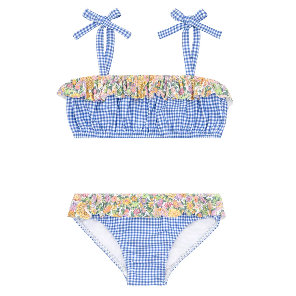 A family favorite for its clean lines and simple details, minnow creates pieces that are playful, polished, and thoughtfully designed for long days, sandy toes, and the wonderment of life on the shore. The Girls Sky Blue Gingham Bandeau Tie Strap Bikini combines sweet gingham checks with a floral yellow ruffle along the chest and waist. Delicate bows adorn the straps when tied for an added feminine touch.