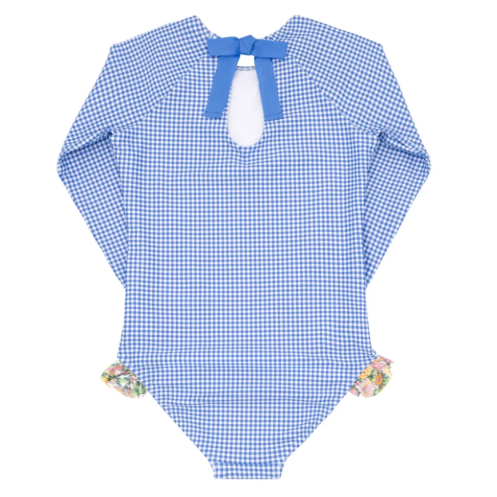 A family favorite for its clean lines and simple details, minnow creates pieces that are playful, polished, and thoughtfully designed for long days, sandy toes, and the wonderment of life on the shore. Featuring long sleeves for more sun-safe coverage, the Girls Sky Blue Gingham Rashguard One Piece has a chic grosgrain ribbon back tie is fixed with a hidden button closure for easy changes and is crafted in a buttery soft fabric that’s fully lined, except for the sleeves, allowing for both movement and breathability. The feminine ruffle hip detail makes this comfortable staple extra sweet.