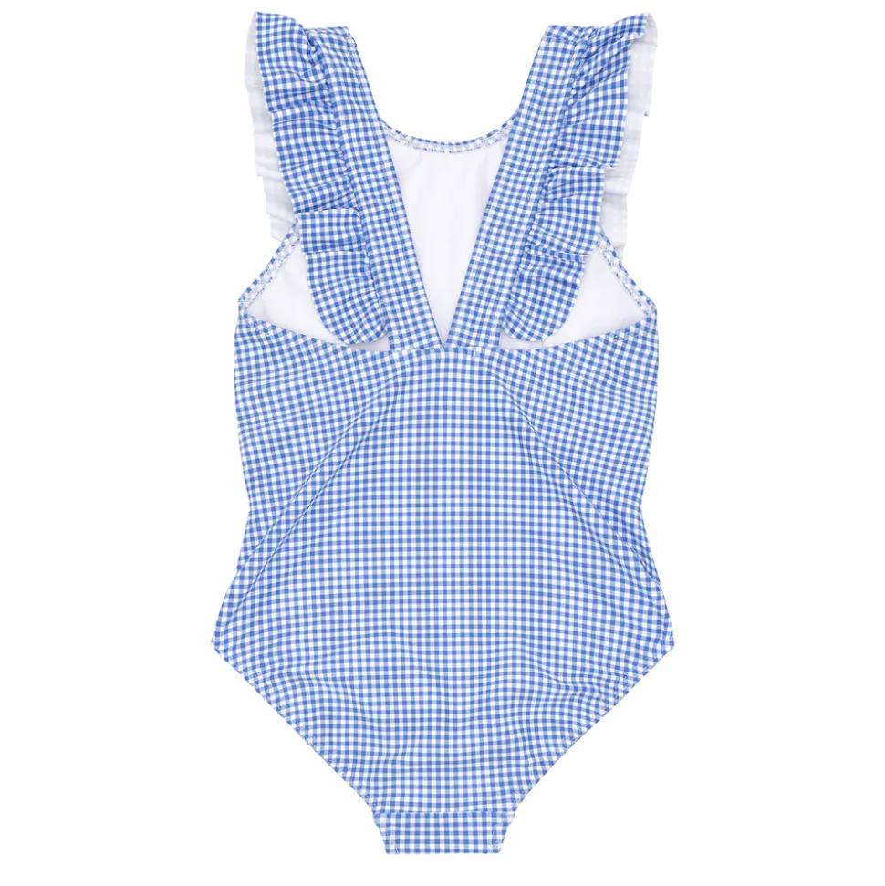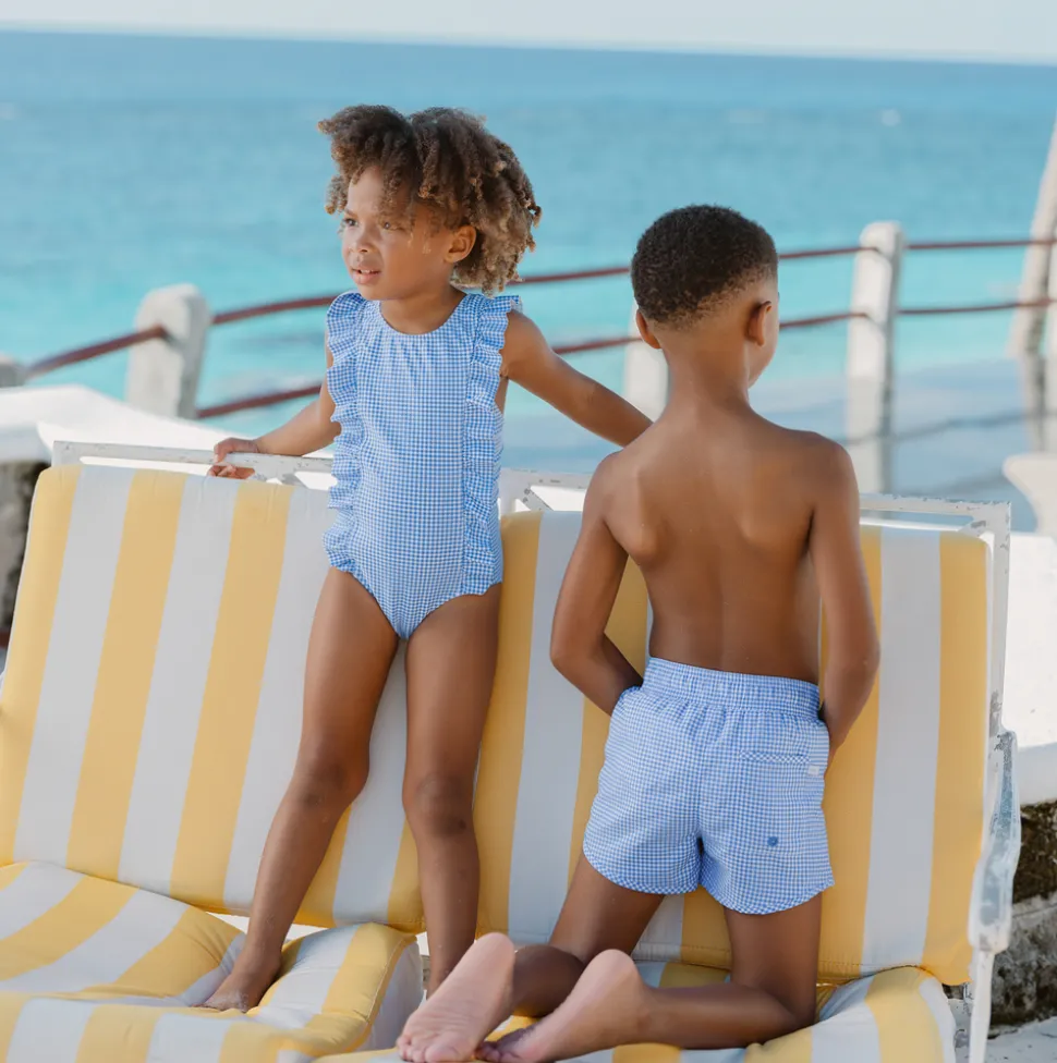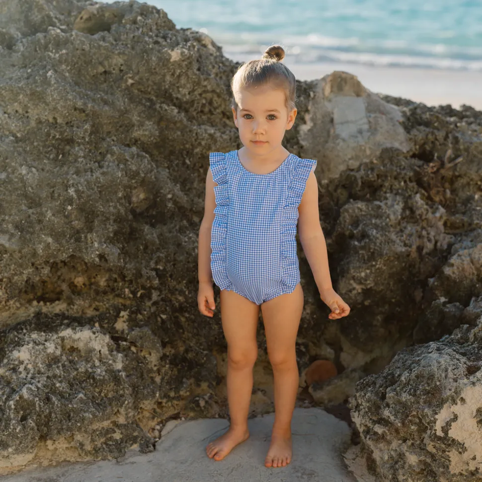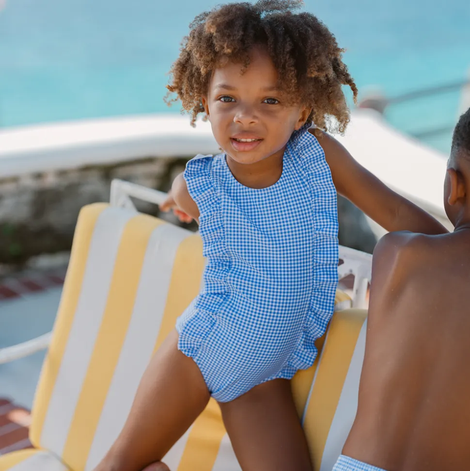 A family favorite for its clean lines and simple details, minnow creates pieces that are playful, polished, and thoughtfully designed for long days, sandy toes, and the wonderment of life on the shore. The Girls Sky Blue Gingham Ruffle One Piece is designed in a European pinafore-style highlighted by feminine ruffle details along the front silhouette and straps. The adorable checkered gingham and sky blue hue will match any sunny pool or beach scene.