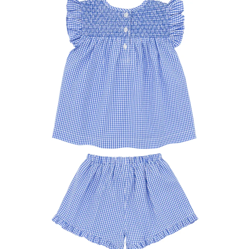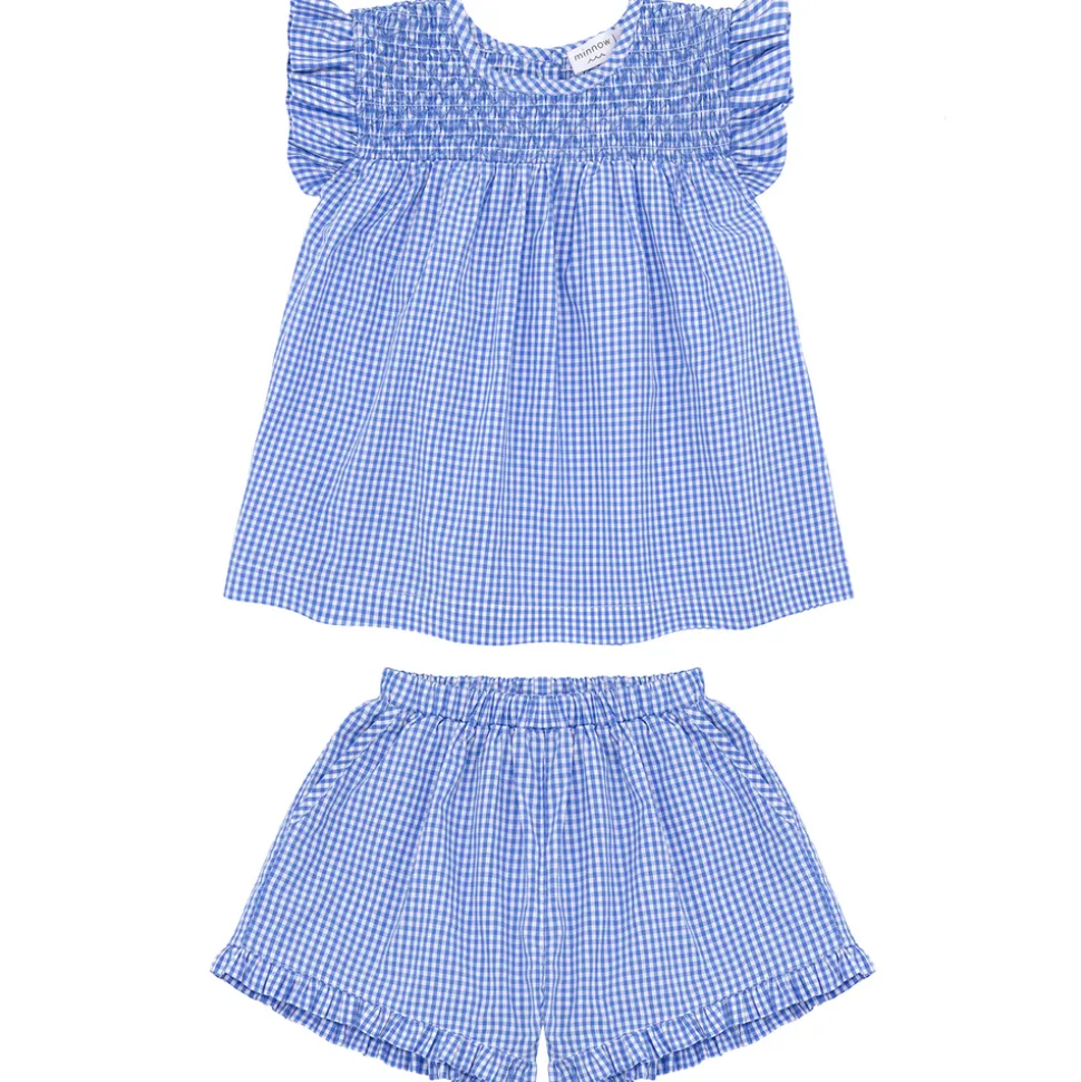A family favorite for its clean lines and simple details, minnow creates pieces that are playful, polished, and thoughtfully designed for long days, sandy toes, and the wonderment of life on the shore. The Girls Sky Blue Gingham Smocked Top And Short Set features a loose-fit smocked top with feminine ruffles at the sleeve with easy pull-on shorts with ruffle trim. It is the ideal outfit for summer play in the sun.