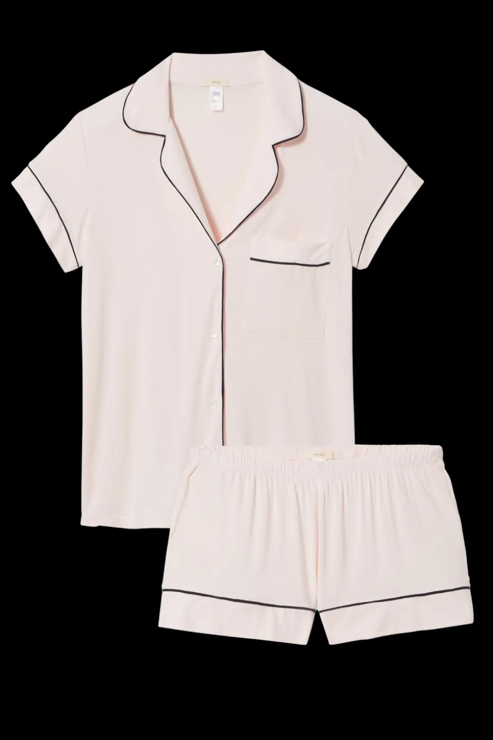 95% TENCEL modal, 5% spandex. Classic slim fit short sleeve top. Button front top with notch collar and functional pocket. Low-rise cheeky short with thin elastic waistband. Contrast piping.