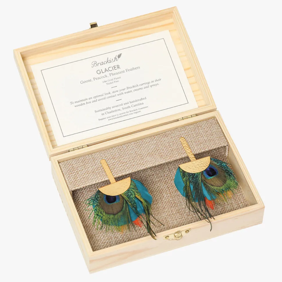Arrives in a hand-branded, pine gift box. Includes a list of feathers used and instructions on how to care for your earrings.