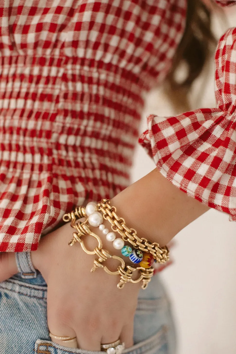The mother-daughter duo behind Brinker + Eliza combine their experience in metalsmithing and fashion to create incredibly unique jewelry that feels custom-made. Employing pearls, shells, and earth’s most prized organic forms, these are pieces to be not just worn but treasured. Featuring one-of-a-kind pearls and millefiori beads, the Glass Half Full Bracelet is the ultimate cool girl accessory.
