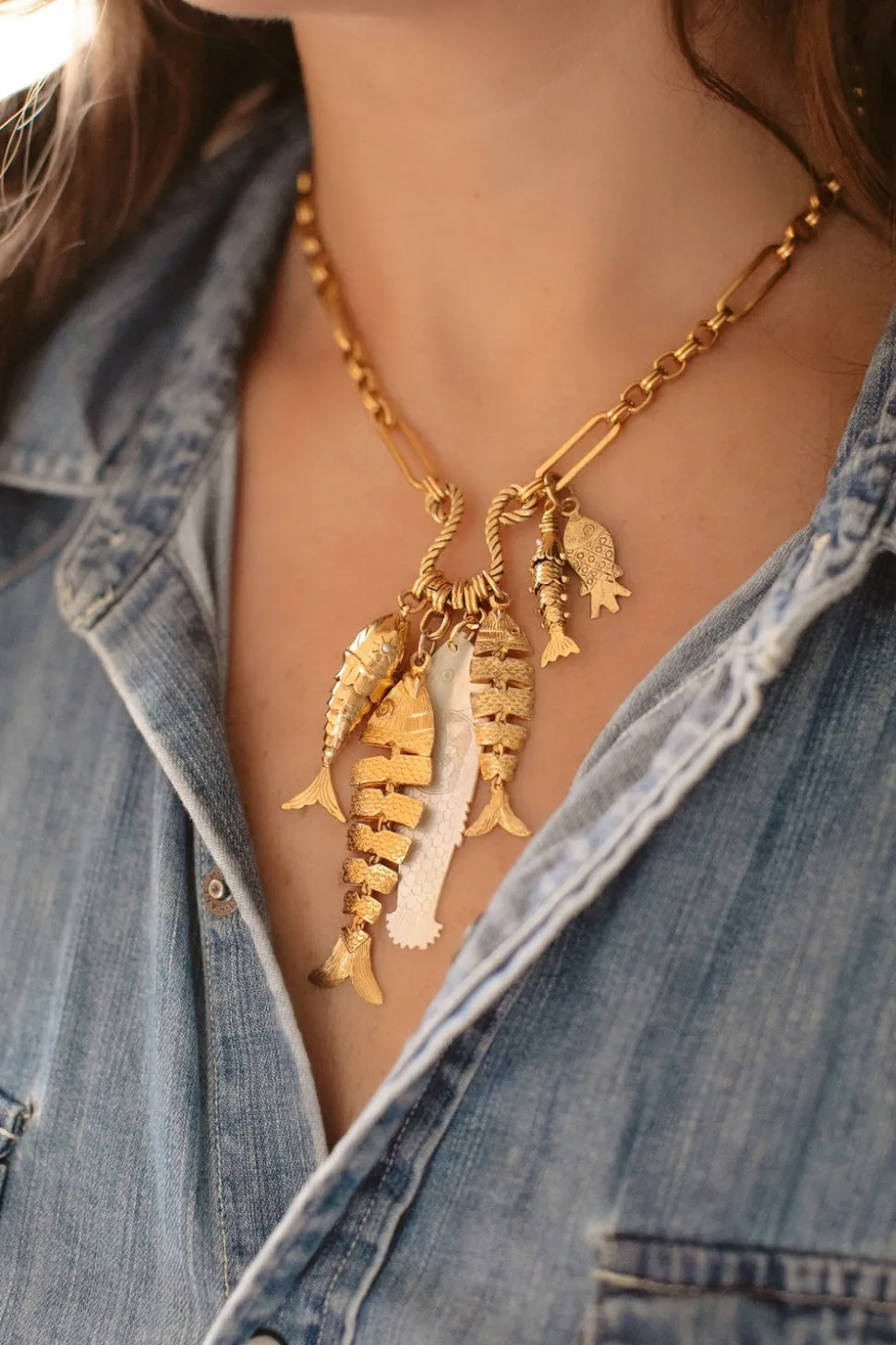The mother-daughter duo behind Brinker + Eliza combine their experience in metalsmithing and fashion to create incredibly unique jewelry that feels custom-made. Employing pearls, shells, and earth’s most prized organic forms, these are pieces to be not just worn but treasured. Featuring one-of-a-kind pearls and pendants, the Go Fish Necklace showcases an assemblage of fish charms on a nautical link.