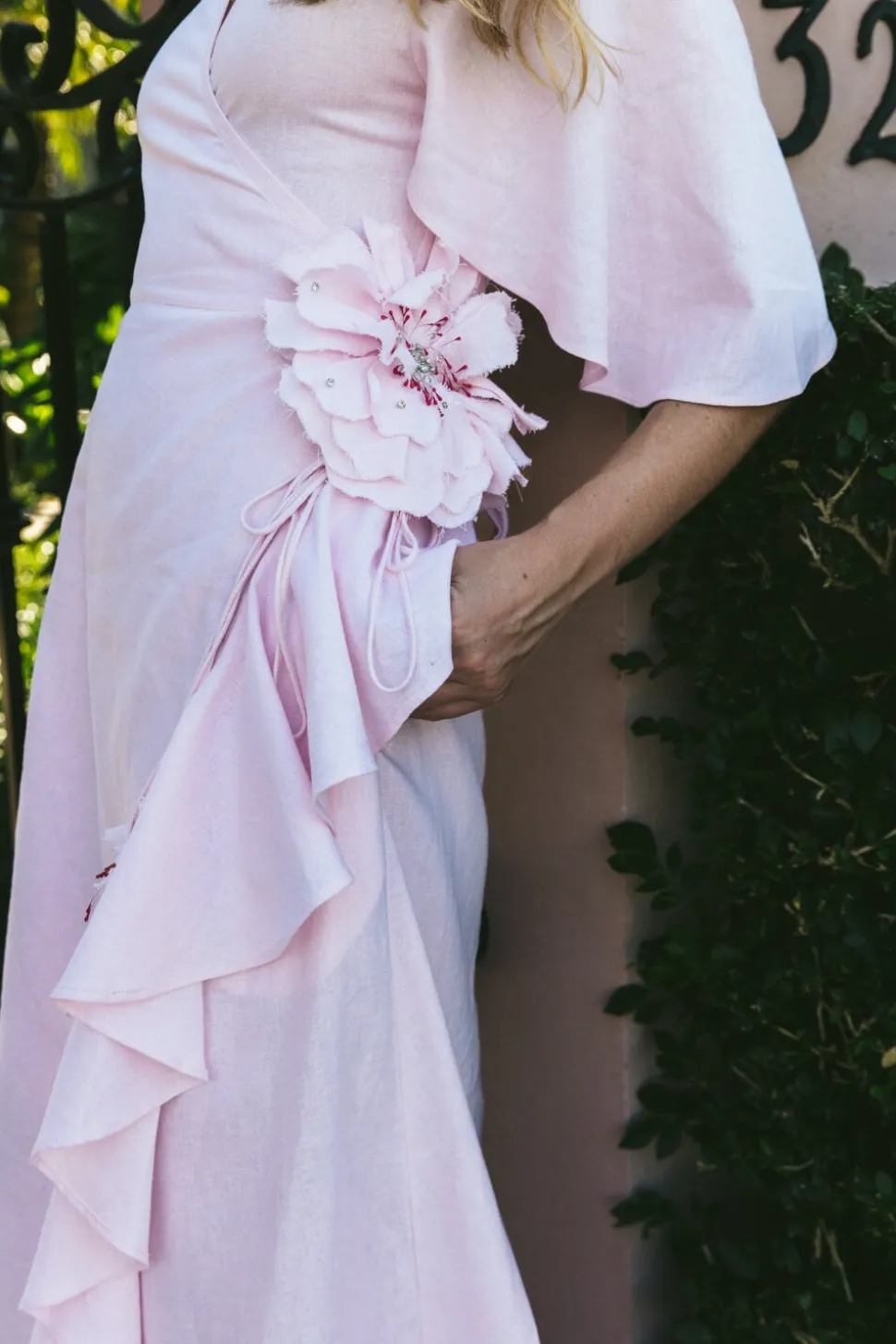 The brainchild of dynamic Iranian mother-daughter duo, Roshanak Varasteh and Leily Amirsardary Ahmed, RosewaterHouse is more than a fashion label; it is a testament to heritage, artisanal craftsmanship, and timeless design. Drawing inspiration from their cherished family heirlooms, Roshanak and Leily pay homage to the rich cultural tapestry of the Middle East, working exclusively with local artisans who breathe new life into age-old techniques, crafting exquisite, limited-edition garments that transcend age, style, and trends. These pieces are sure to become some of your most treasured. The Gol Wrap Dress in Pink is adorned with a stunning handmade flower with handmade petals and butterfly sleeves.