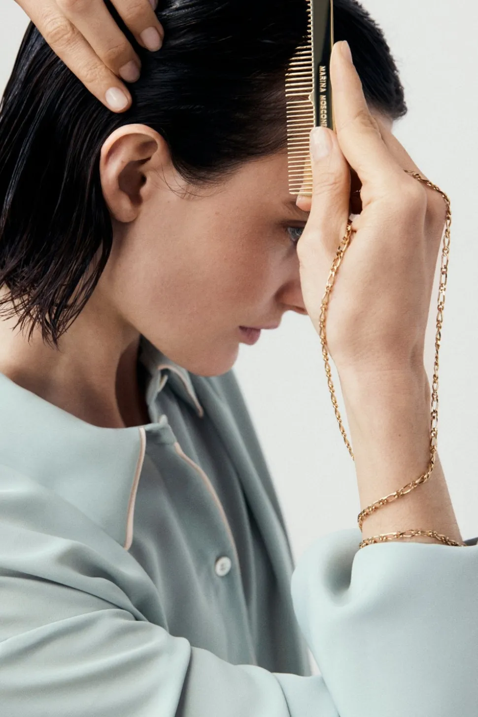 Founded in 2016 by sisters Marina and Francesca Moscone, the label gravitates toward a tactile approach, twisting and draping fabrics by hand to create a softly seductive design using custom jacquards, fil-coupés, and silk wools, all exclusively developed in Italy, rendered in precise shapes and tailoring. The Gold Comb Necklace is a sculptural adornment crafted in Italy from 24k gold-plated brass, bringing a bold yet refined finish to any look.