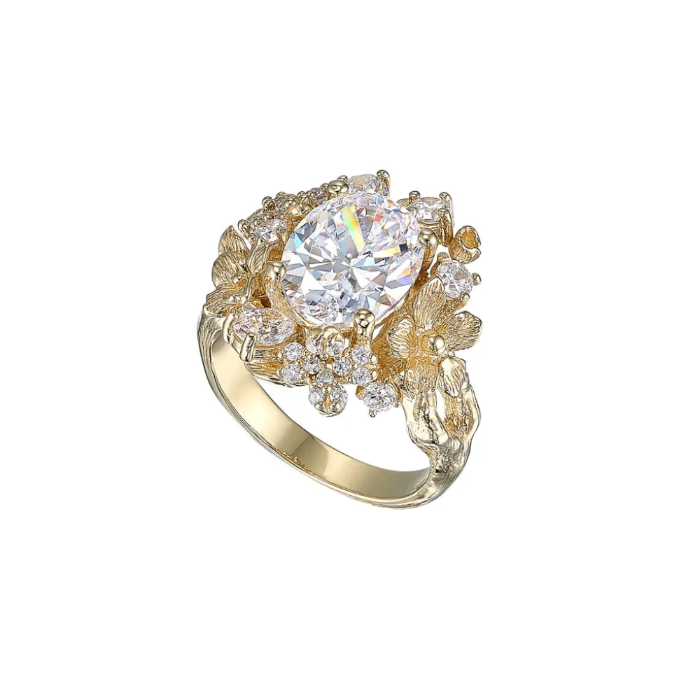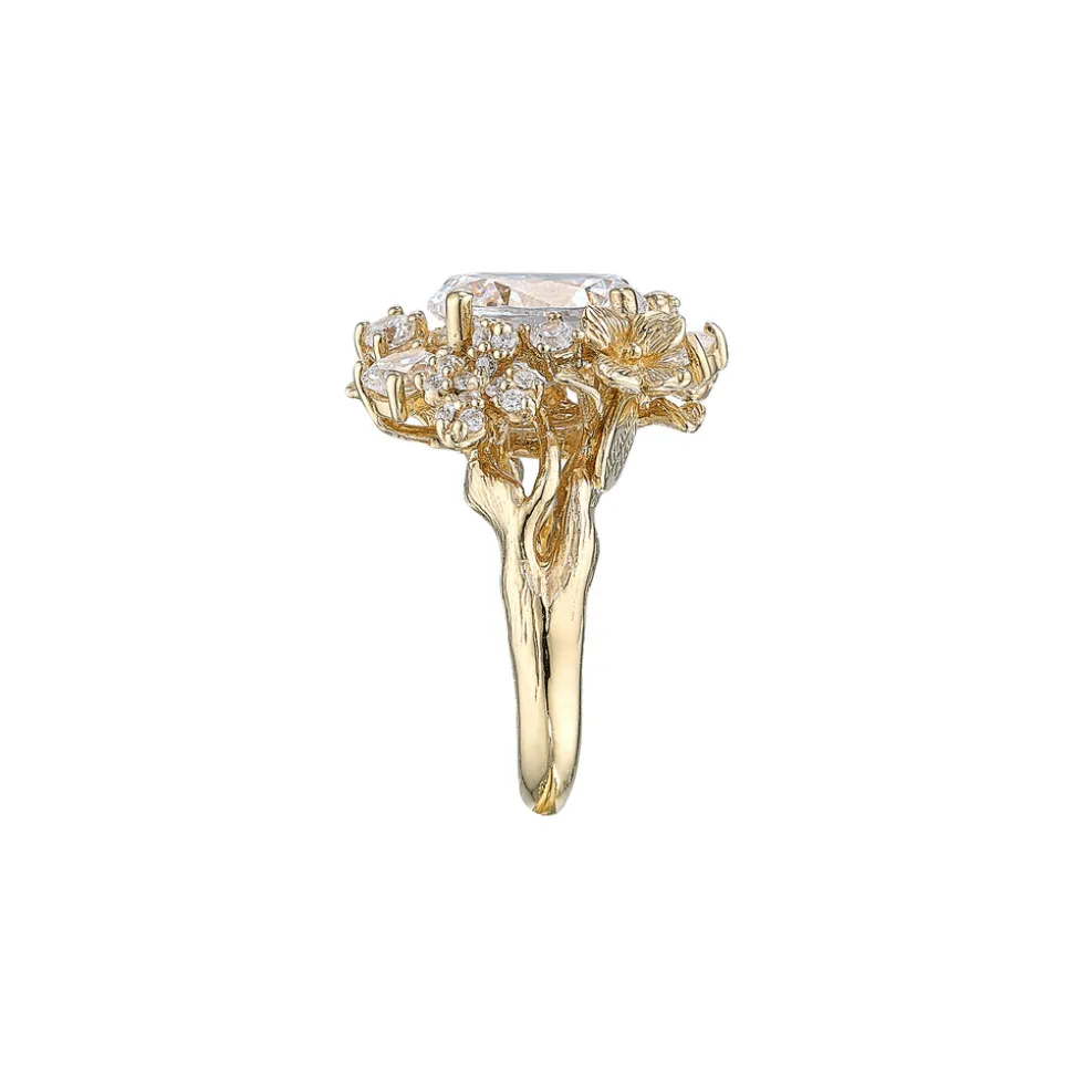 London-based Anabela Chan’s background in architecture and luxury fashion led to the first fine jewelry line to champion laboratory-grown gemstones. Today, its artisanal craftsmanship and sustainable innovations have found a place in the collections of royals, Rihanna, Taylor Swift, and sophisticated women worldwide. The Golden Posy Diamond Ring is a true stunner featuring one large center stone with intricately hand-set laboratory-grown simulated white diamonds.