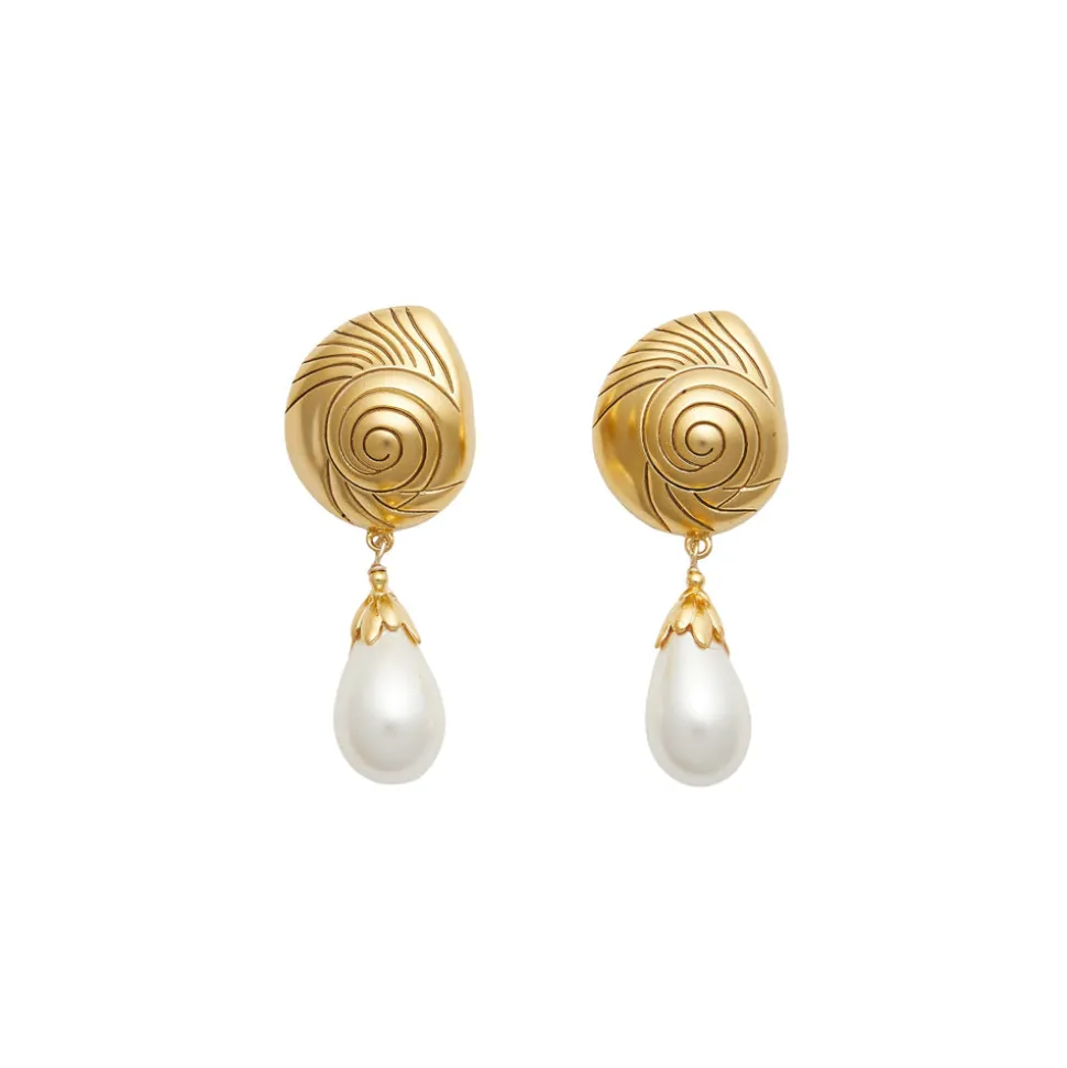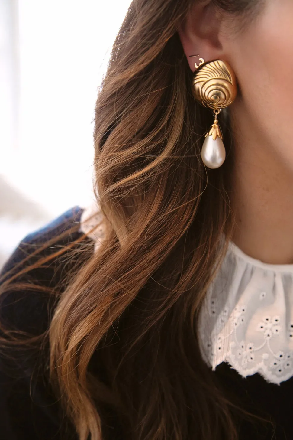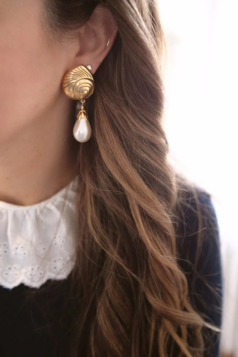Vintage glass pearls hang from 24K antique gold-plated engraved shell toppers on stainless steel hypoallergenic posts. Lightweight.