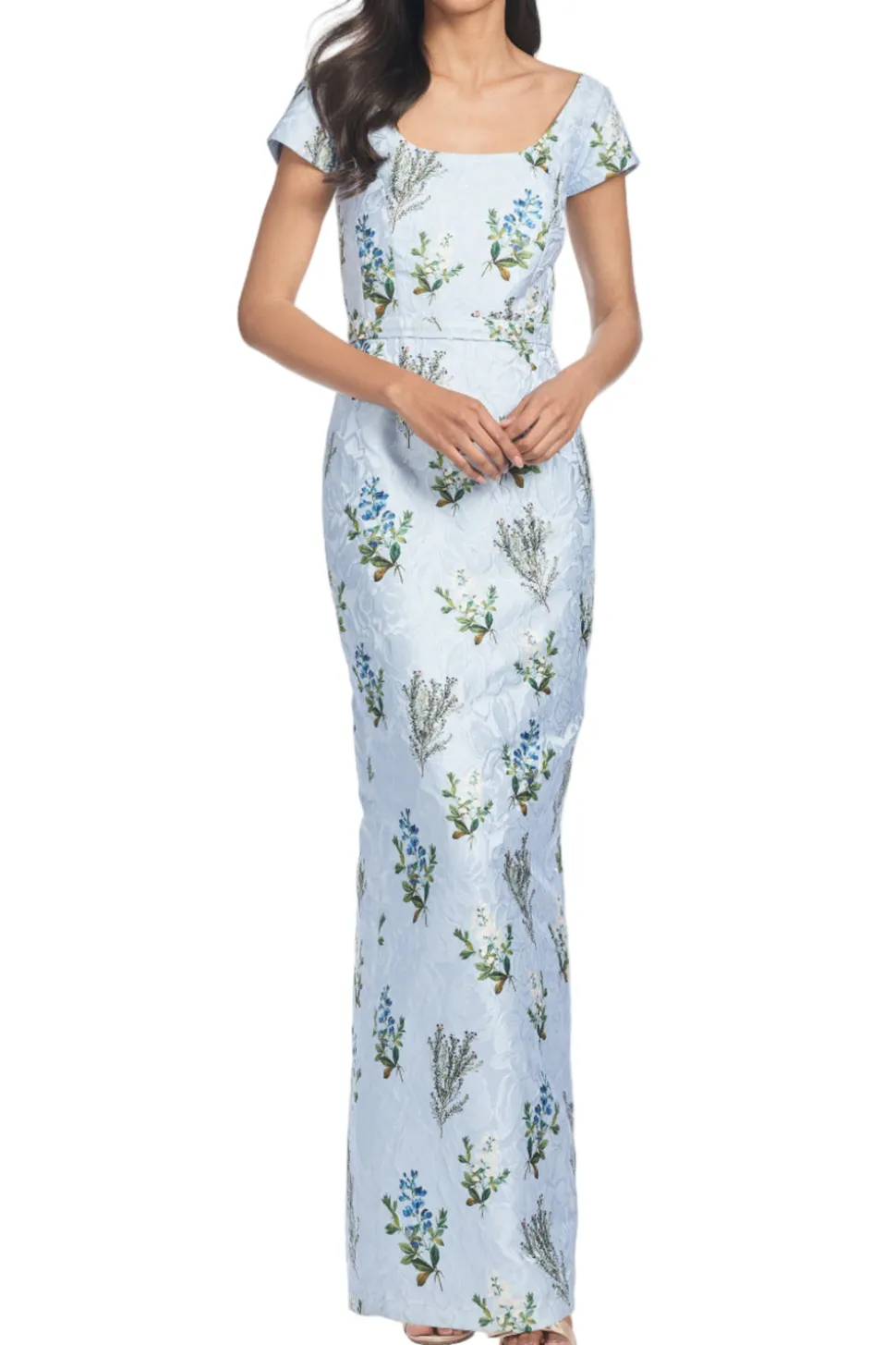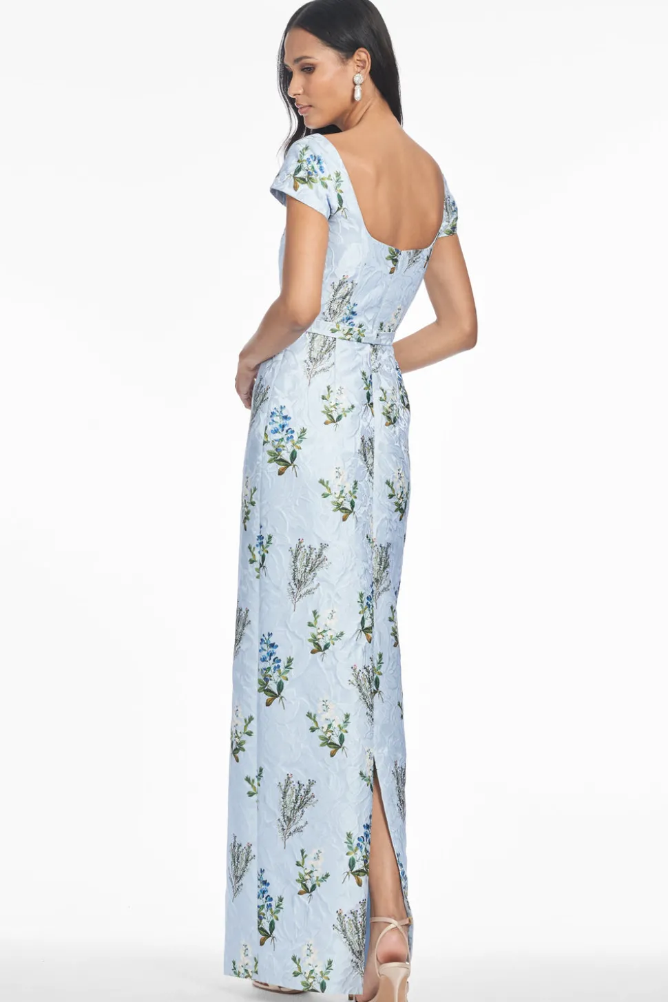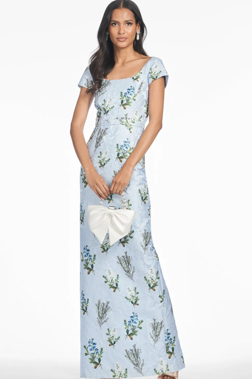 Born in India, Sachin and Babi bonded at New York’s Fashion Institute of Technology and launched an embroidery business, working with top houses, like Oscar de la Renta and Manolo Blahnik. Today, the brand works with their own factory in Mumbai, controlling quality at every stage, and producing womenswear that is at once unique, beautiful, and wearable. The Grace Gown in Cloud Blue is an exclusive limited-edition design, crafted in Italian cloque that exudes sophistication. With cap sleeves, a fitted bodice, and a slim A-line skirt, this gown flatters the figure with timeless elegance. Produced in only a few pieces, it is a truly special style for discerning wardrobes.