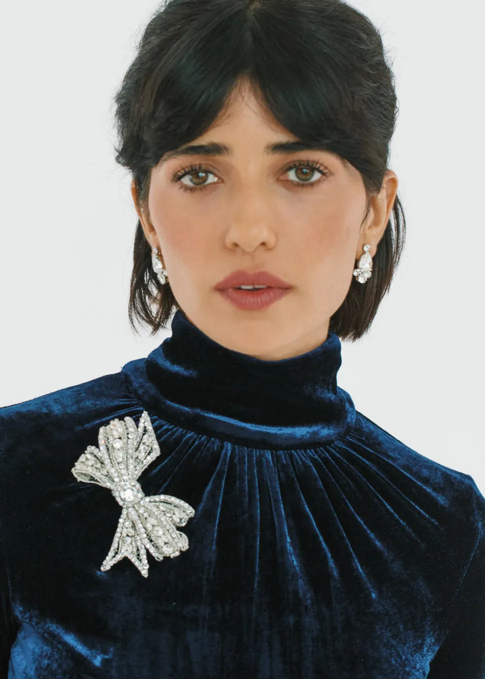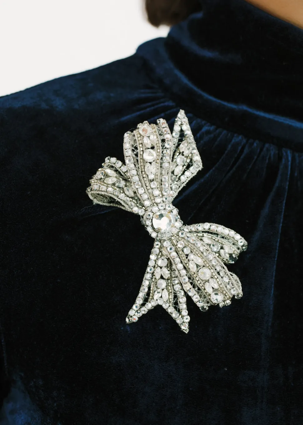 “Everything has a story to tell,” says Jennifer Behr, the founder of her namesake luxury hair accessory brand that has blossomed into one of New York City’s foremost ateliers for jewelry, as well as bridal. In every crystal, pearl, and ribbon, you’ll find the utmost quality and a sense of romance, as each piece reveals a modern interpretation of centuries-old regalia. The Gracelyn Brooch in Crystal is our latest favorite way to don a bow. This shapely bow is hand-embroidered with crystals and metallic thread, with precision suggesting the movement of an actual ribbon unfurling. It fastens with a classic brooch closure, making it easy to style a number of ways—or to layer multiples at once.