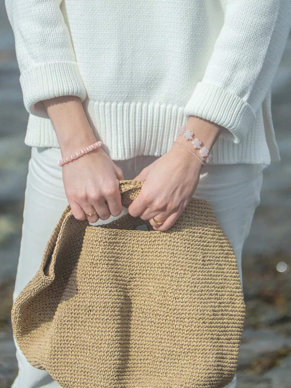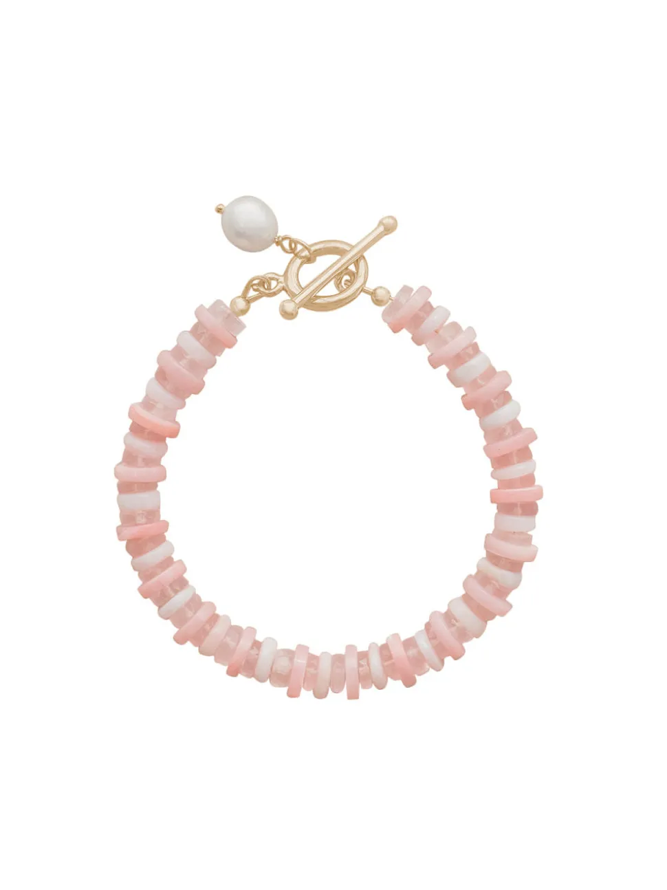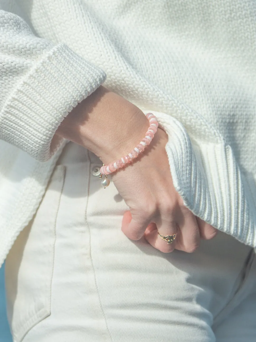 From Newport, Rhode Island, designer Kerry McGauley uses her experience in the fashion industry and inspiration from the town’s picturesque shoreline to craft singular yet timeless pieces—shining at the most memorable events and through your everyday. Adorned with freshwater pearls, mother of pearl, and Peruvian opal and rose quartz gemstones, the Gracie Bracelet in Pink features a gold-plated toggle closure.