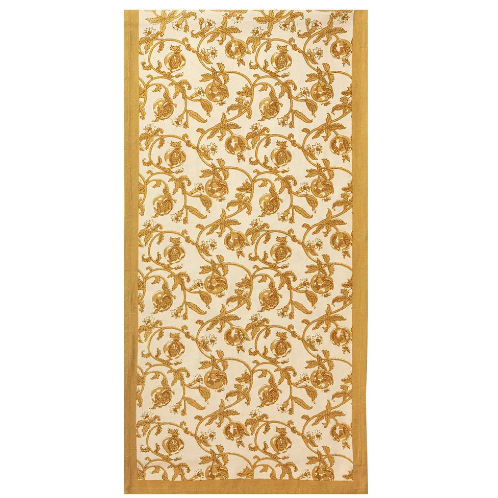 Idyllic landscapes, sumptuous colors, and the vibrant beauty of Southern France describes Couleur Nature. This brand of hand-painted table linens aims to bring a Provençal sense of effortlessness, rich culture, and joie de vivre to your life and home—no matter where you live. The Granada Runner in Mustard features a delicately intertwined floral pattern with mustard pomegranates atop a white background. Creating a tranquil mood, this runner creates a beautiful landscape for all of your delicacies. An elegant addition to any tablescape.