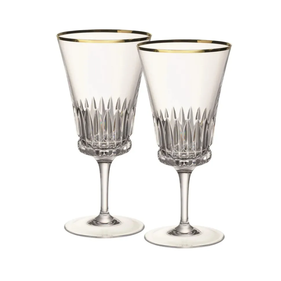With over 275 years of heritage, this family-owned brand has become a global symbol of refined European living. Blending time-honored craftsmanship with forward-thinking design, Villeroy & Boch elevates everyday moments with beauty, quality, and enduring style. The Grand Royal Gold Water Goblet Pair in Clear & Gold features two elegantly crafted clear glass water goblets accented with luxurious gold detailing. Measuring approximately 3.75″ in diameter and 7.75″ in height, these sophisticated glasses are ideal for serving water or festive beverages with refined style.